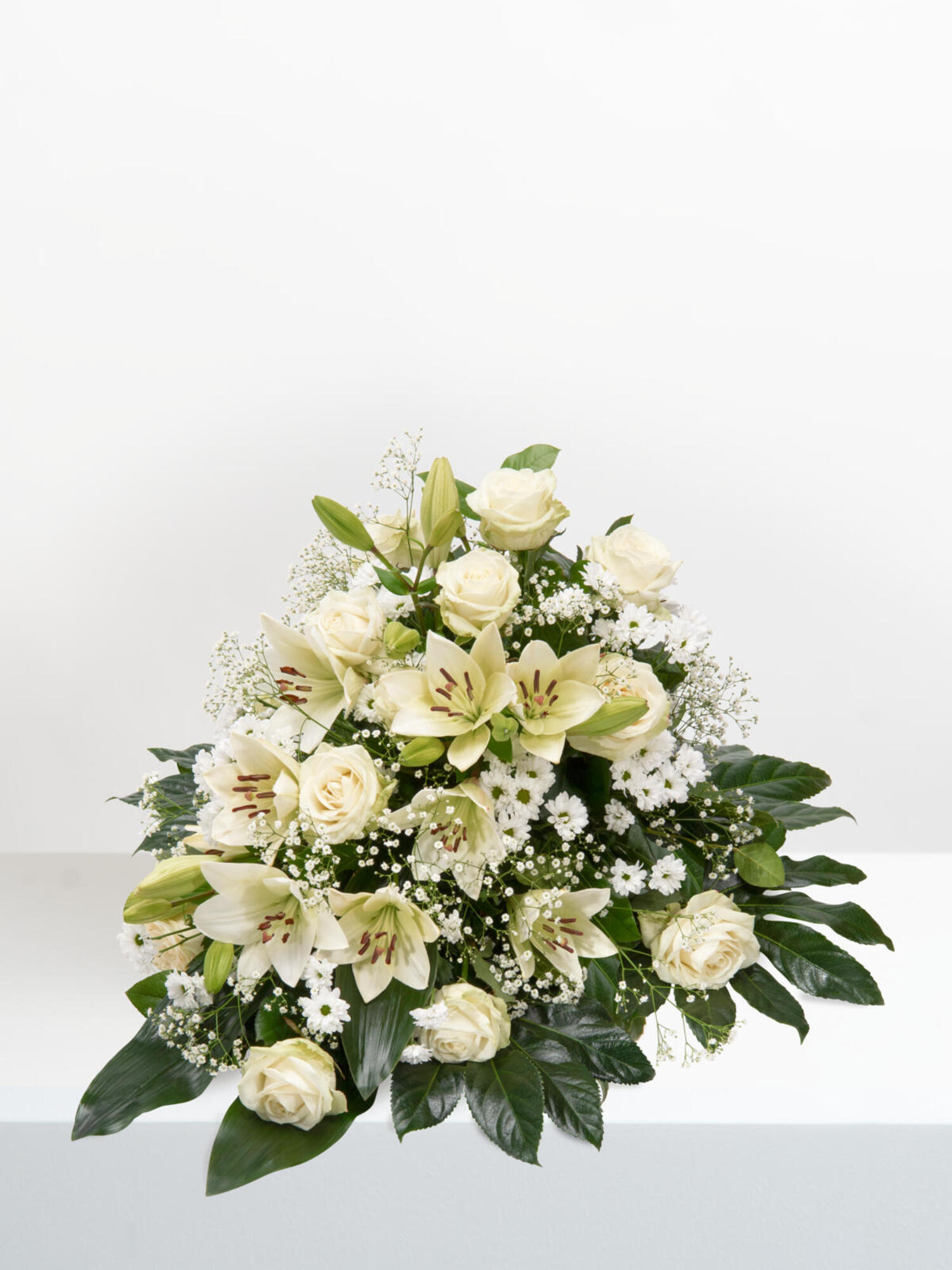 Trauergesteck in dezentem Weiß-Grün mit Rosen, Santini, Schleierkraut und Lilien. Als Beiwerk werden Pistazie, Salal, Aralie und Aspidistra verwendet.