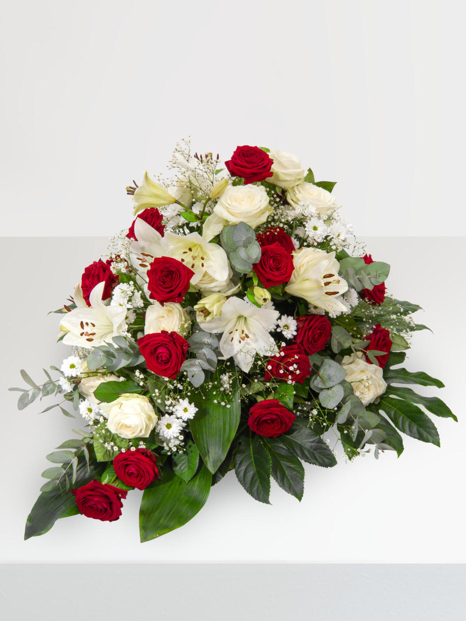 Trauergesteck in Rot-Weiß mit Rosen, Santini, Schleierkraut und Lilien. Als Beiwerk werden Pistazie, Aralie, Salal, Eukalyptus und Aspidistra verwendet.