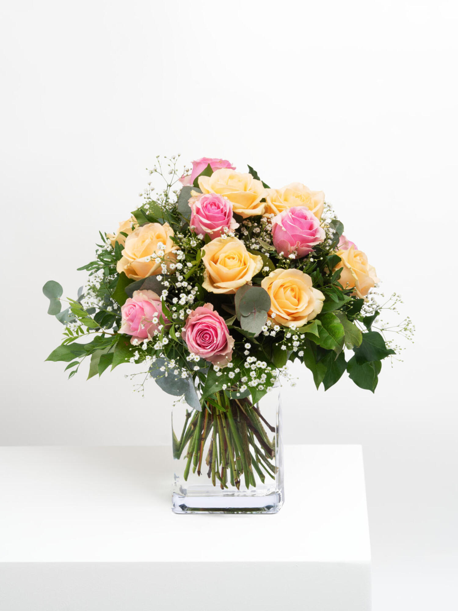 Rund gebundener Trauerstrauß in Rosa-Apricot mit Rosen und Schleierkraut. Als Beiwerk werden Eukalyptus, Salal und Efeu verwendet.