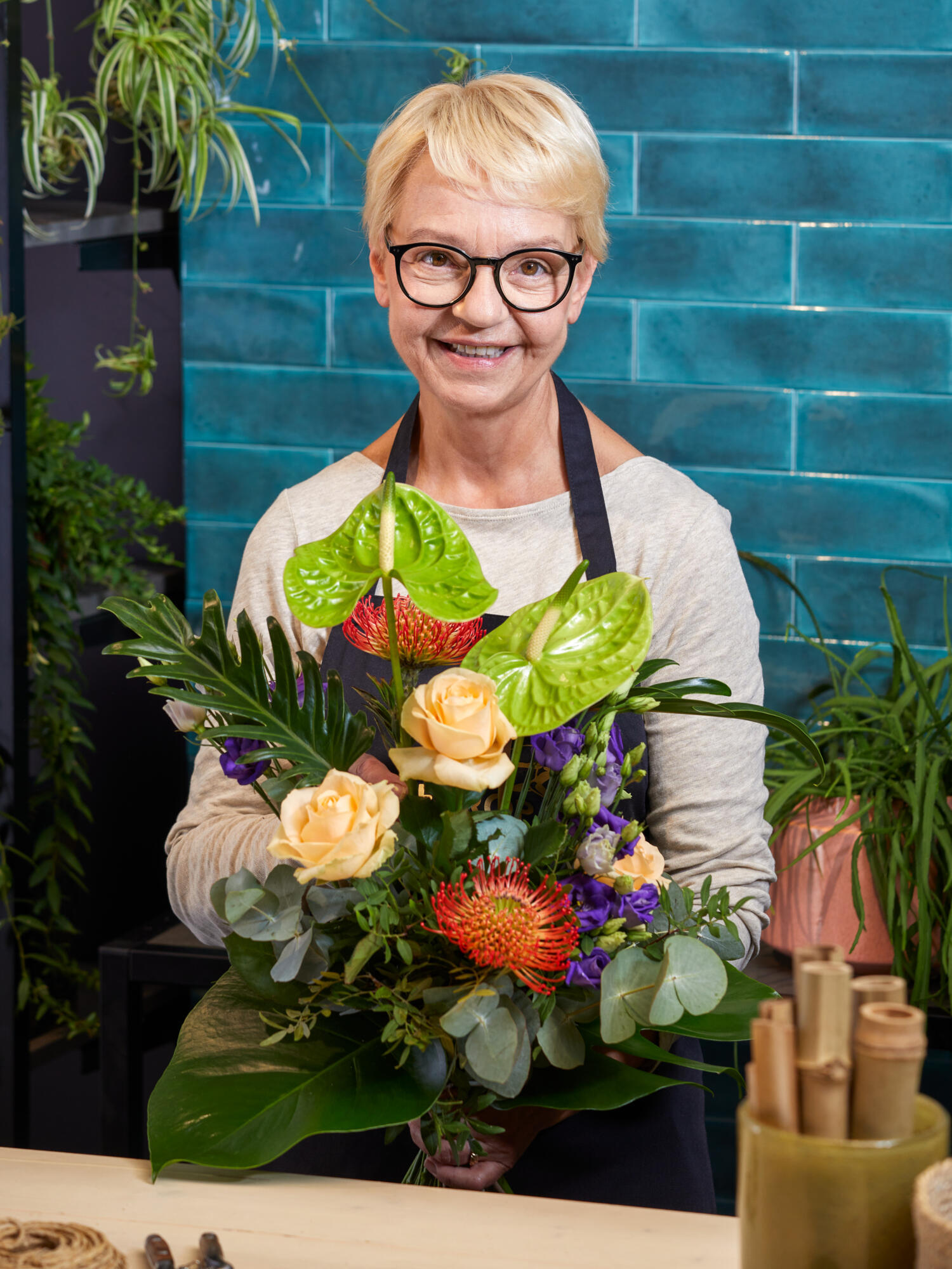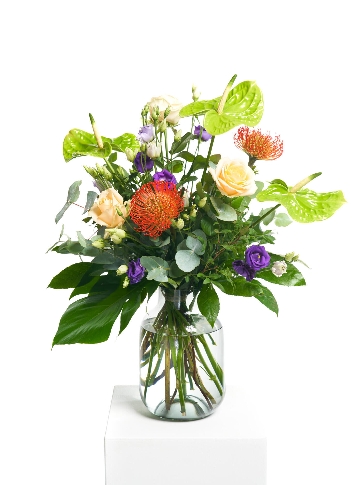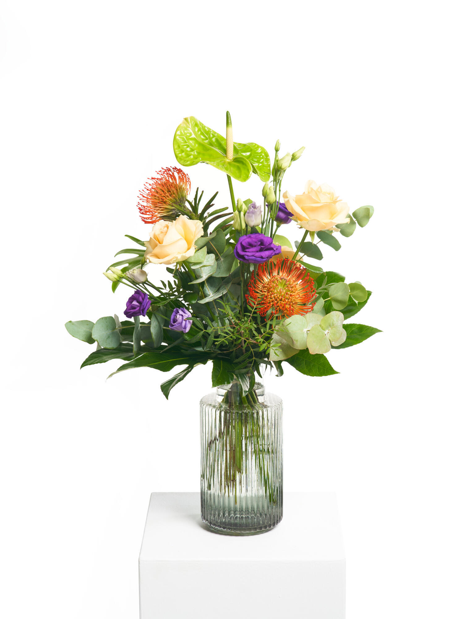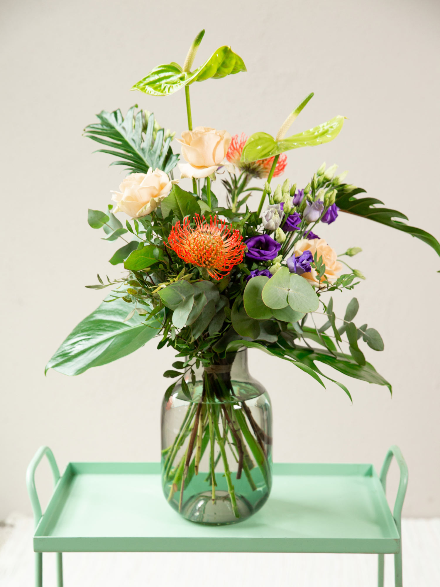 Gestaffelt gebundener Strauß in Apricot-Orange-Violett-Grün mit Rosen, Anthurien, Nadelkissen (Nutans) und Eustoma. Als Beiwerk werden Eukalyptus, Pistazie, Aralie, Phildendron ‚Xanadu‘ und Monsterablätter verwendet.