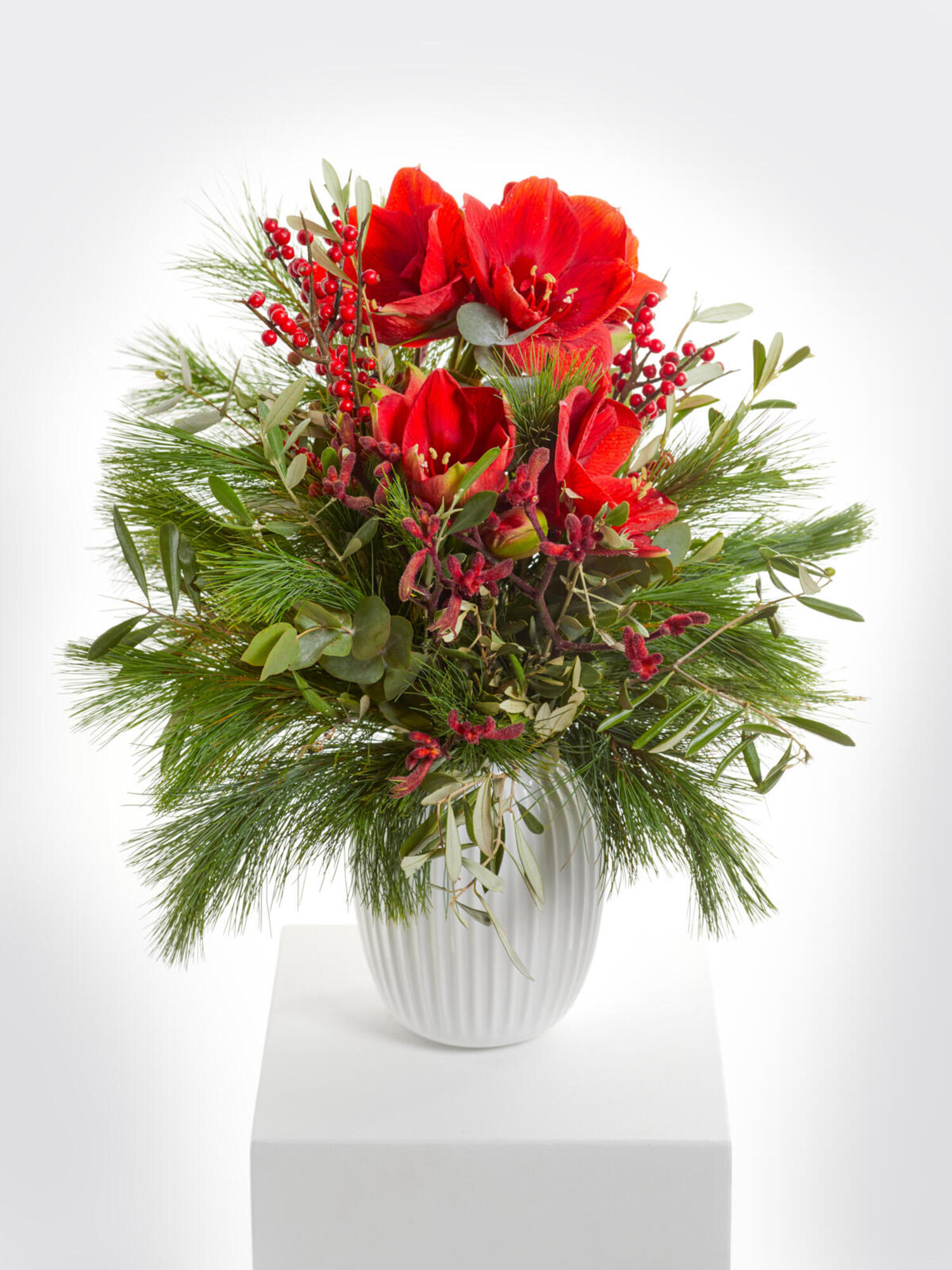 Locker gebundener Strauß in Rot mit Amaryllis, Ilex und Kängurupfötchen. Als Beiwerk werden Eukalyptus, Kiefer und Olive verwendet. Bei geschlossenen Amaryllis kann das vollständige Aufblühen bis zu 2-4 Tagen dauern.