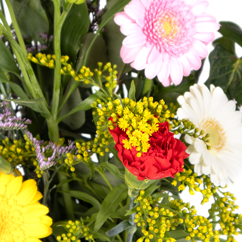 Sommerlich bunter Feldblumenstrauß Dieser Blumenstrauß ist Freude pur, denn hier vereinen sich die schönsten und fröhlichsten Farben. Beim Anblick an diesen bunten Blumenstrauß denken wir an den Sommer in seinen schönsten und wärmsten Facetten und an tanzende Schmetterlinge auf einer Blumenwiese. Herrlich! Dieser lockere Blumenstrauß ist das perfekte Geschenk für fröhliche Anlässe, denn seine Farben stehen für das pure Leben. Die buntesten Rosen, Gerbera, Germini, Rittersporn, Löwenmäulchen und viele weitere Blumen sorgen für ein herrliches Sommergefühl. Für uns ist dieser Blumenstrauß wortwörtlich ein Sommermärchen. So ein schöner Strauß macht nachweislich glücklich. In einer hohen Vase ziert er jeden Raum und sorgt für eine ausgelassene Atmosphäre. Zum Geburtstag, zum Jubiläum oder als Dankeschön genau der richtige Blumenstrauß. Wem möchtest du das bunte Glück ins Haus bringen? Nicht vergessen: Sende mit deinen Blumen eine lustige Videobotschaft an den Empfänger oder die Empfängerin und sorge für Staunen.