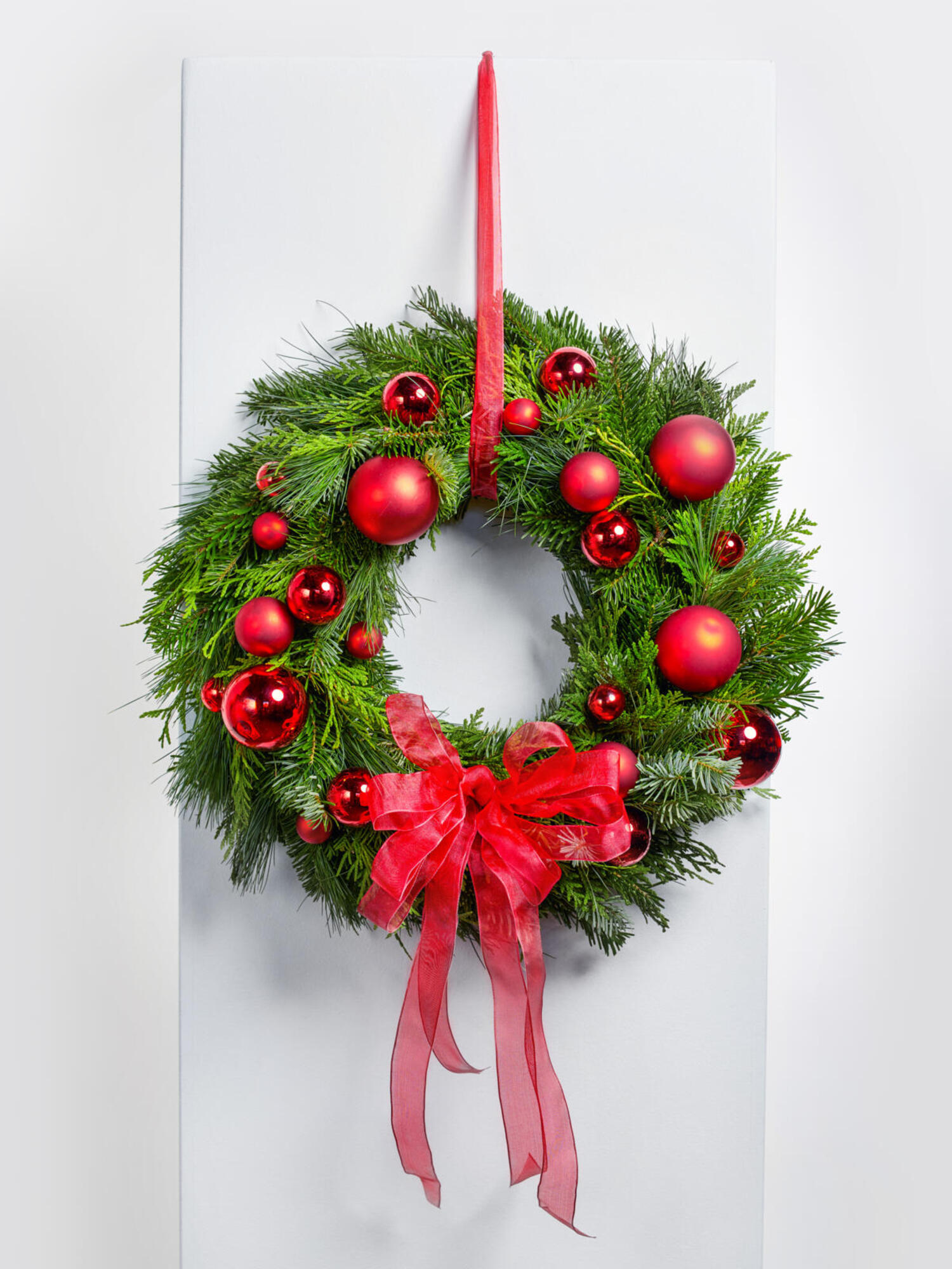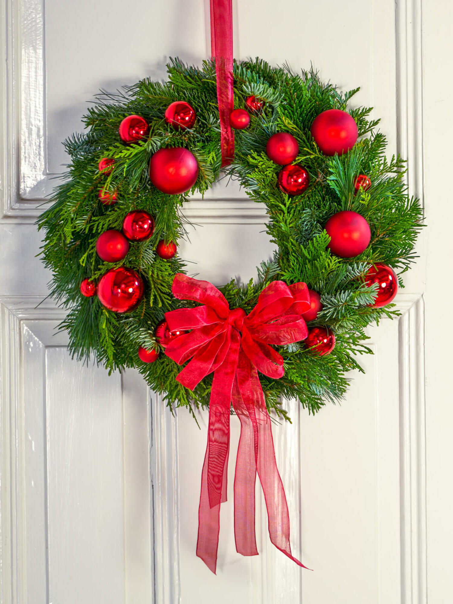 Heißen Sie Ihre liebsten Gäste von ganzem Herzen willkommen. Mit diesem wundervollen Türkranz öffnen sich zum Fest der Liebe nicht nur Türen, sondern auch Herzen. Weihnachts-Türkranz aus Konifere in Grün-Rot mit roten Weihnachtskugeln aus Glas und rotem Organzaband. Durchmesser ca. 35 cm.