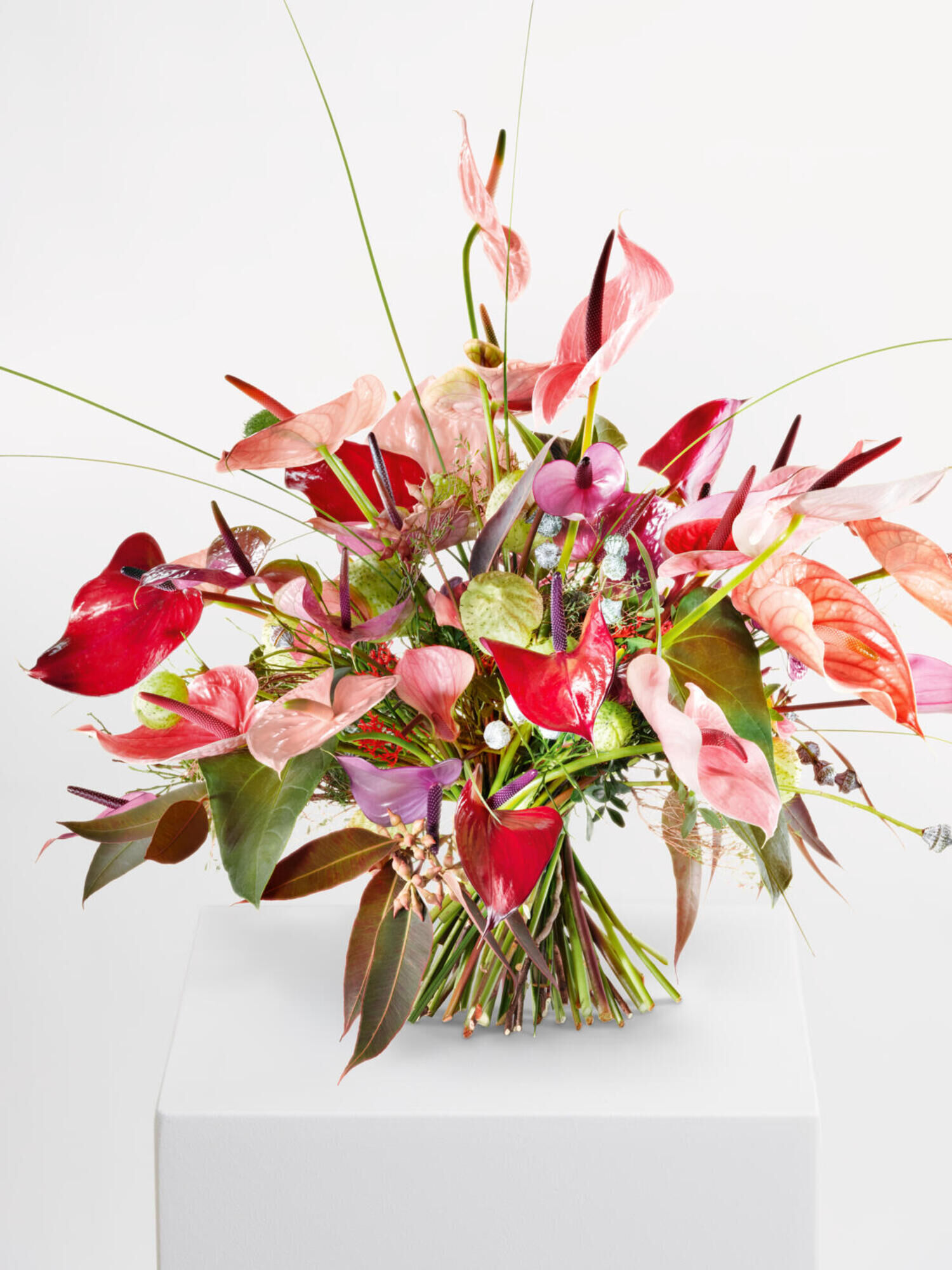 Der herrlich bunte Strauß Sparkle strahlt eine unbändige Vitalität und sprühende Energie aus. Verschiedene Anthurien in Violett-Pink-Rosé wurden locker gebunden zu einem Meisterwerk der Lebenfreude verarbeitet.