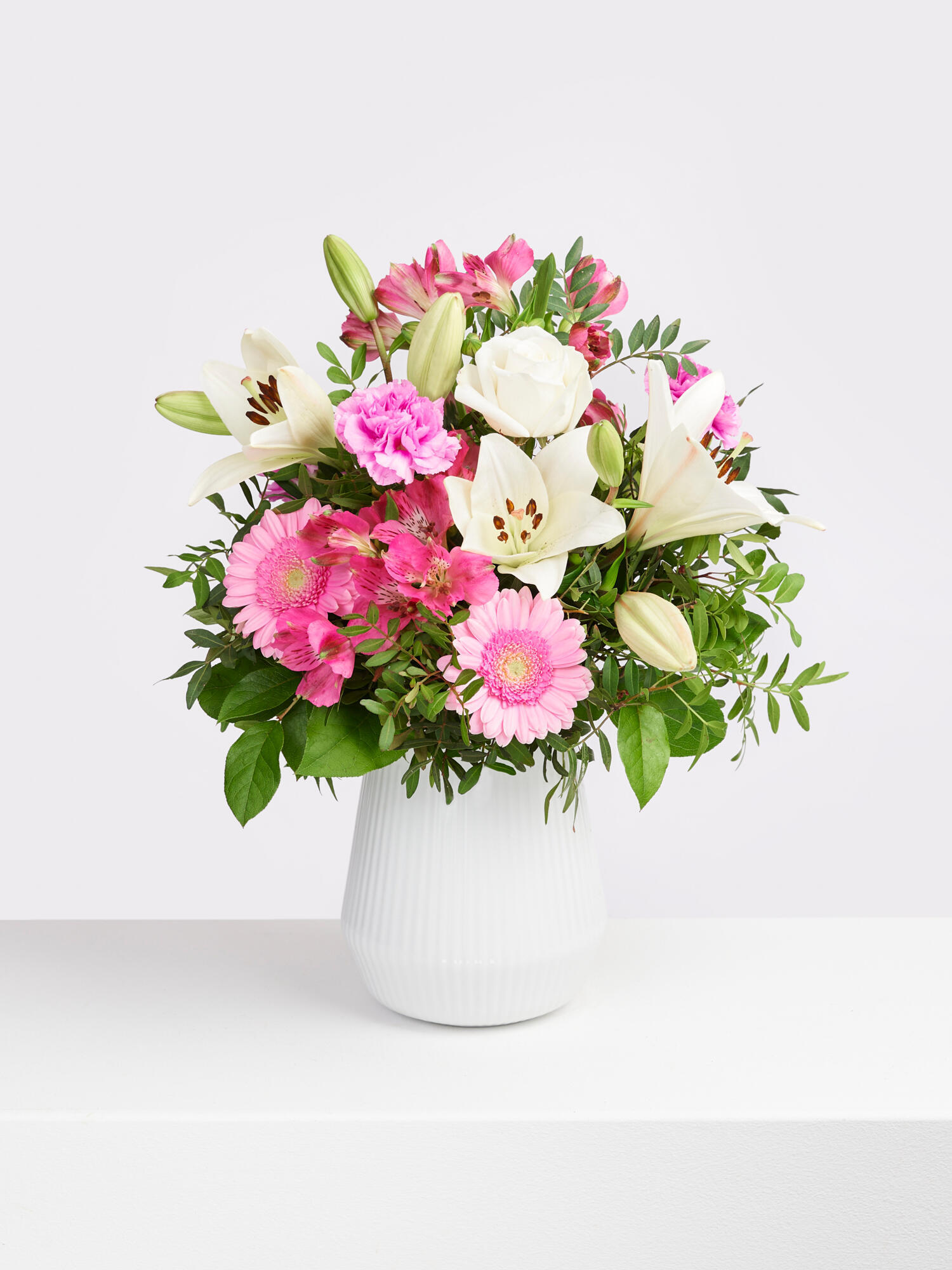 Eleganz trifft auf Verspieltheit: Dieser Strauß vereint klassische Schönheit mit modernem Flair und bereitet garantiert Freude! Die Kombination aus weißen, stark duftenden Lilien und zarten Rosen, sowie farbenfrohen Nelken, Inkalilien (Alstromerien) und Germini ist ein echter Hingucker. Als Beiwerk werden Pistazie und Salal verwendet. Ob als Geschenk zum Geburtstag, Jubiläum oder einfach so – dieser Strauß ist immer eine gute Wahl. Intensiv duftender Strauß mit Lilien, Rosen, Nelken, Inkalilien, Germini, Pistaziengrün und Salal Liebevoll von Hand gebunden und von Natur aus einzigartig Hinweis: Knospige Lilien benötigen bis zu 5 Tage bis sie vollständig aufgeblüht sind