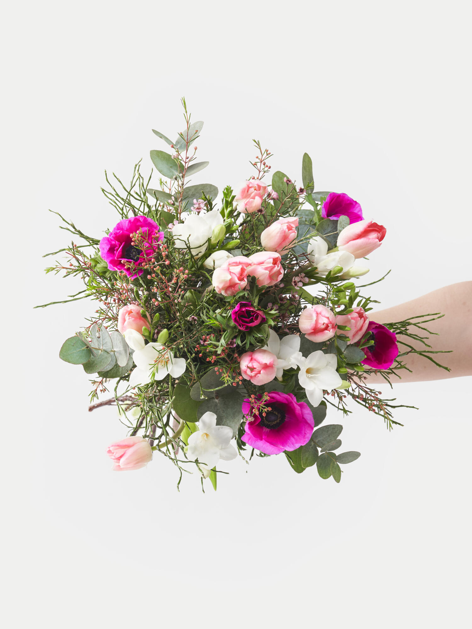Verschenken Sie einen wunderschönen Frühlingsstrauß in zarten Farben. Aufgelockert gebundener Strauß in Weiß-Rosa-Pink mit Tulpen, zart duftenden Freesien, Anemonen, Waxflower, Heidelbeere und etwas Eukalyptus.