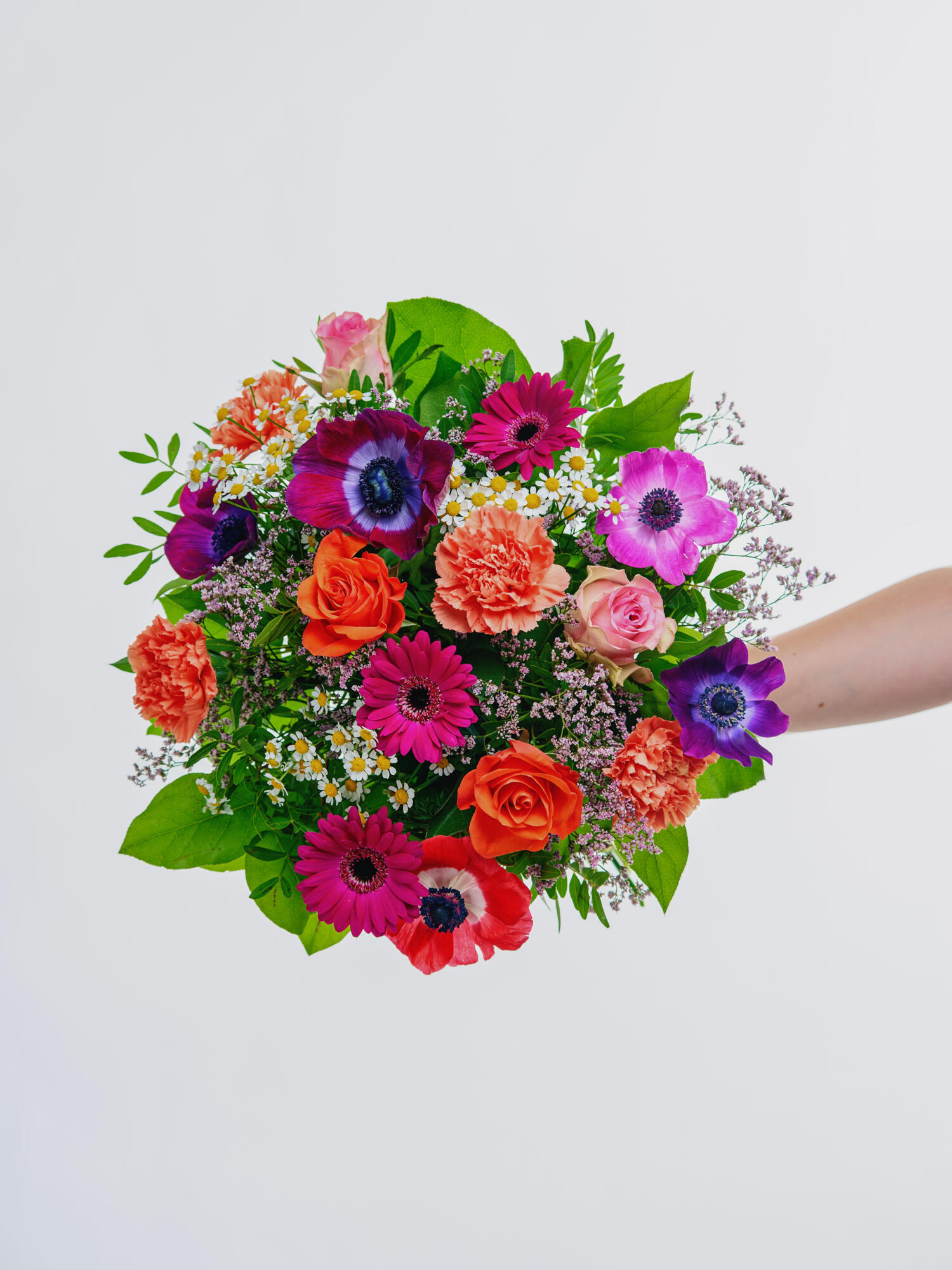 Locker gebundener bunter Strauß mit Anemonen, Rosen, Nelken, Germini, Kamille und Limonium. Als Beiwerk werden Salal und Pistazie verwendet.