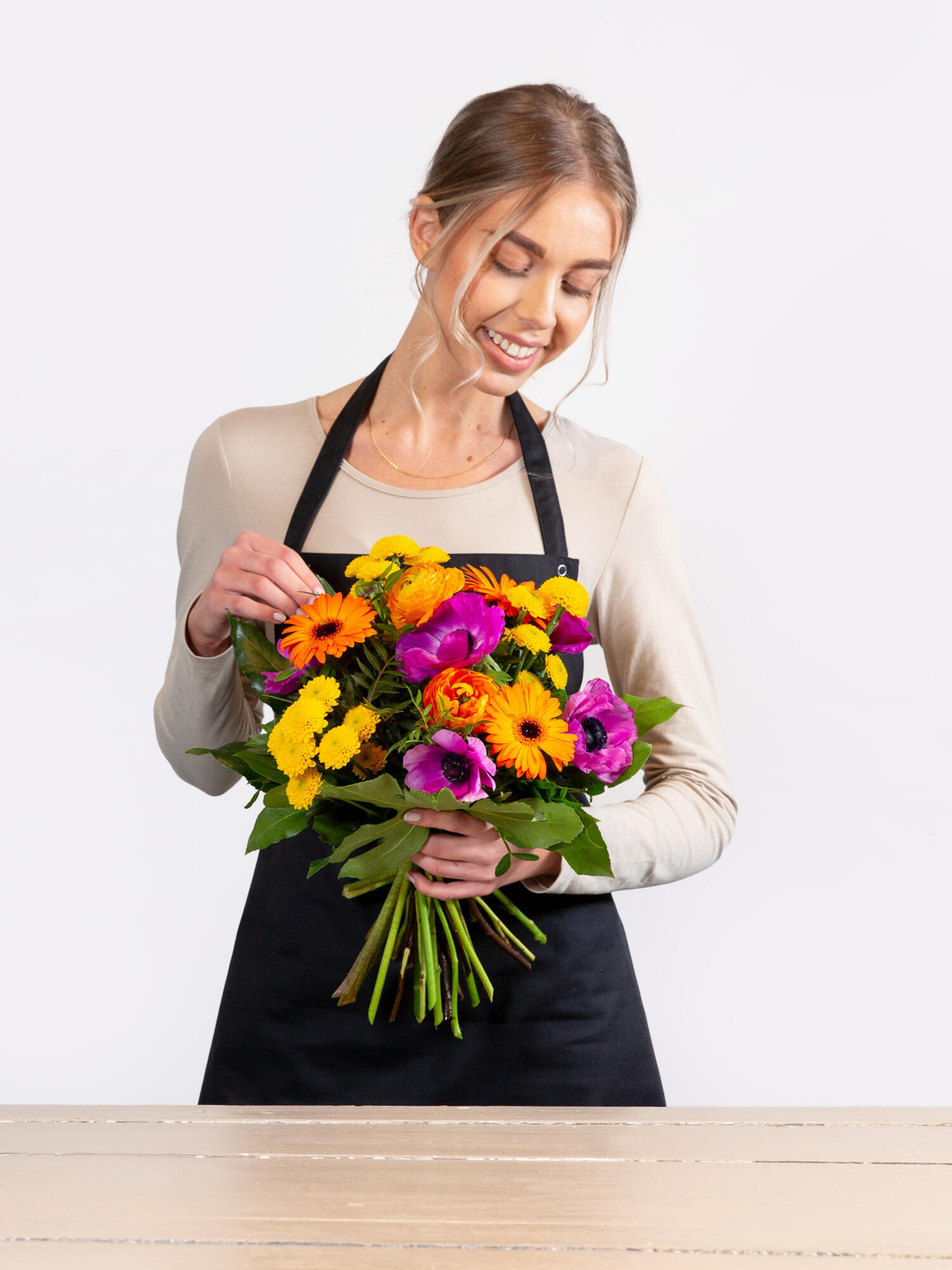 Rund gebundener Strauß in Orange-Pink-Gelb mit Germini, Santini, Anemonen und Ranunkeln. Als Beiwerk werden Aralie, Pistazie und Salal verwendet.