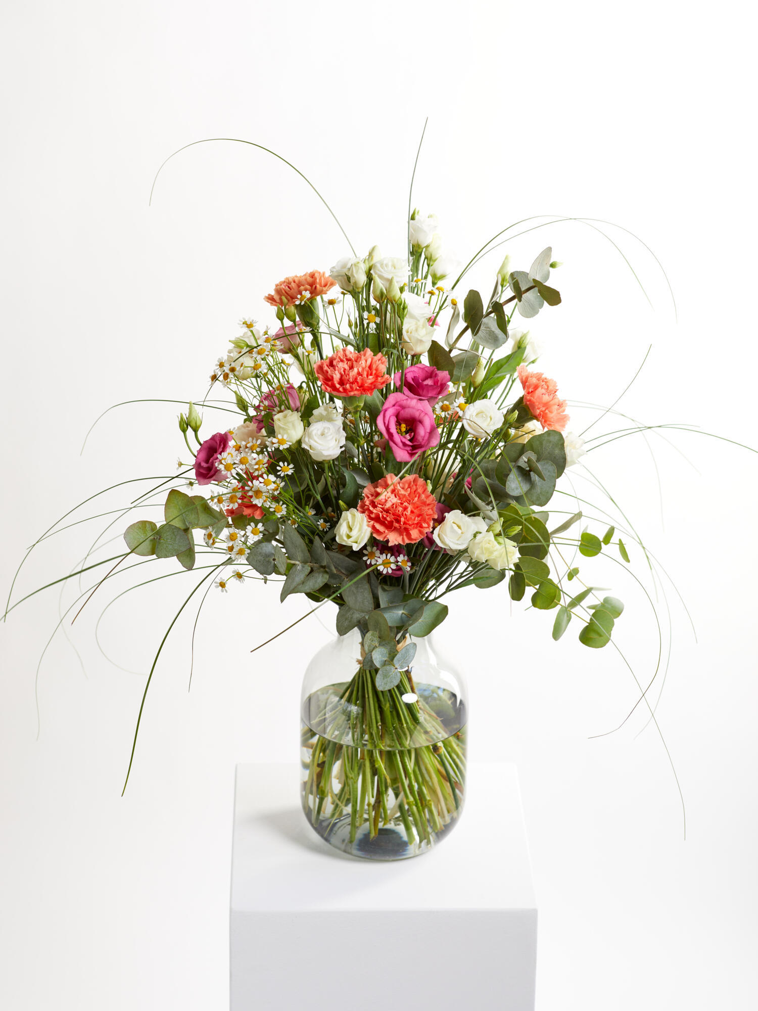Lang und wiesig gebundener Strauß in Apricot-Rosa-Weiß mit Nelken, Eustoma, Lilien und Kamille. Als Beiwerk werden Eukalyptus und Bärgras verwendet.