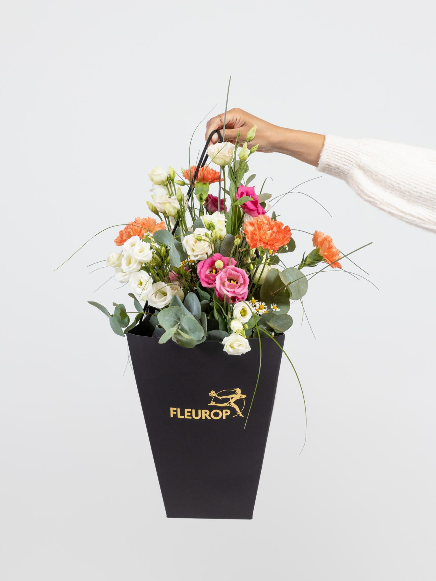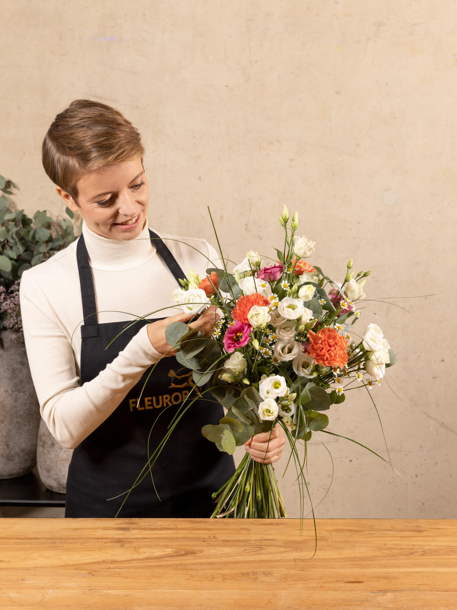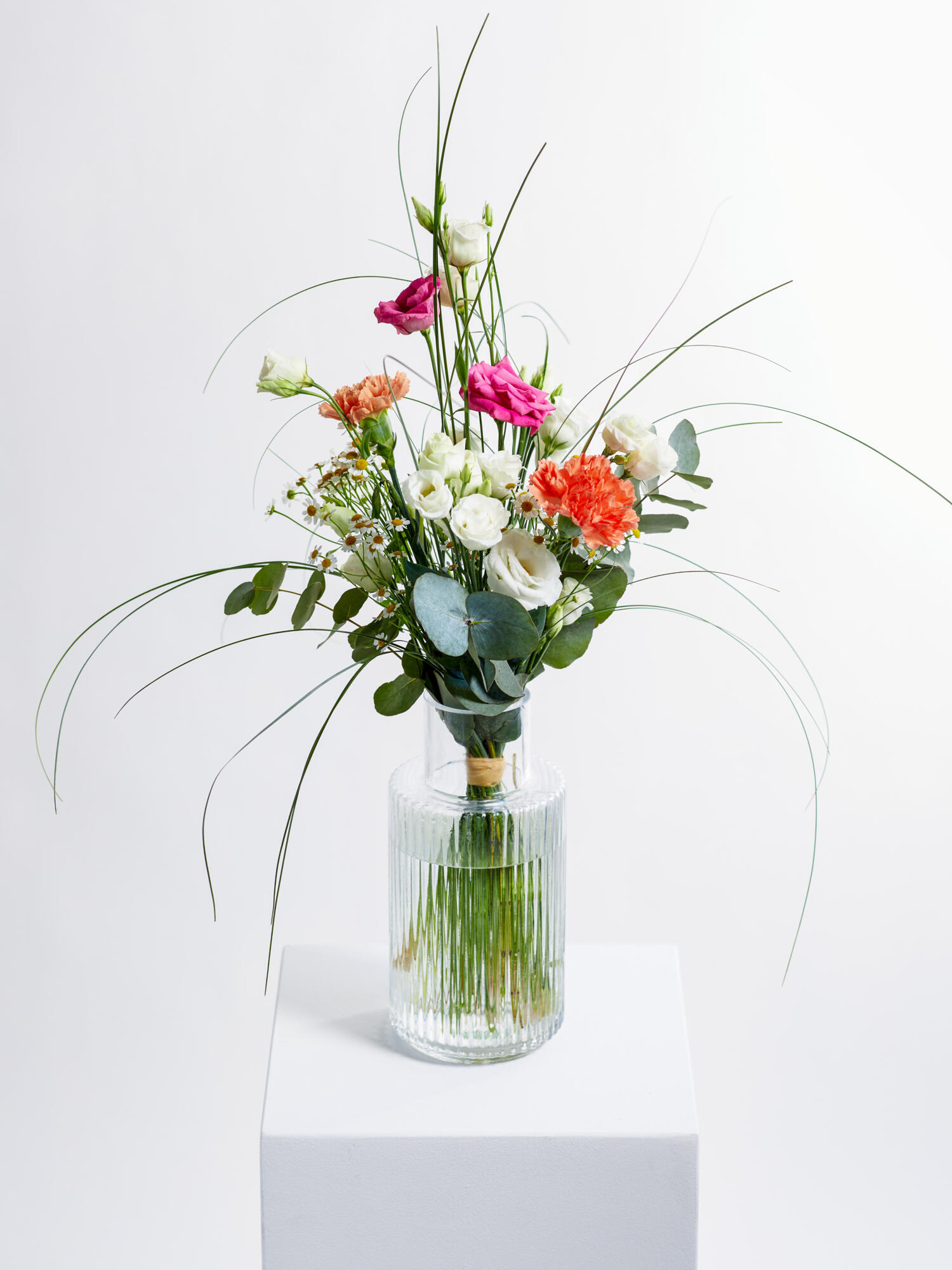 Lang und wiesig gebundener Strauß in Apricot-Rosa-Weiß mit Nelken, Eustoma, Lilien und Kamille. Als Beiwerk werden Eukalyptus und Bärgras verwendet.