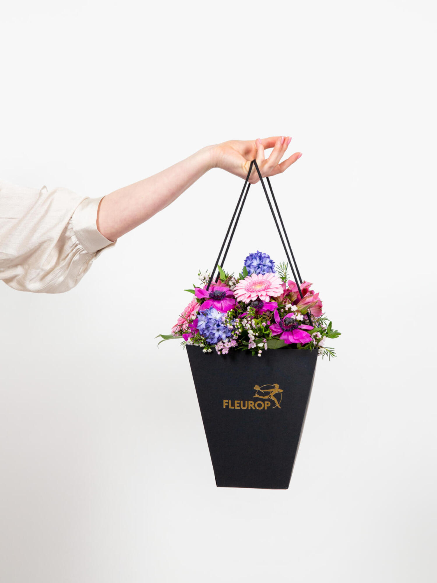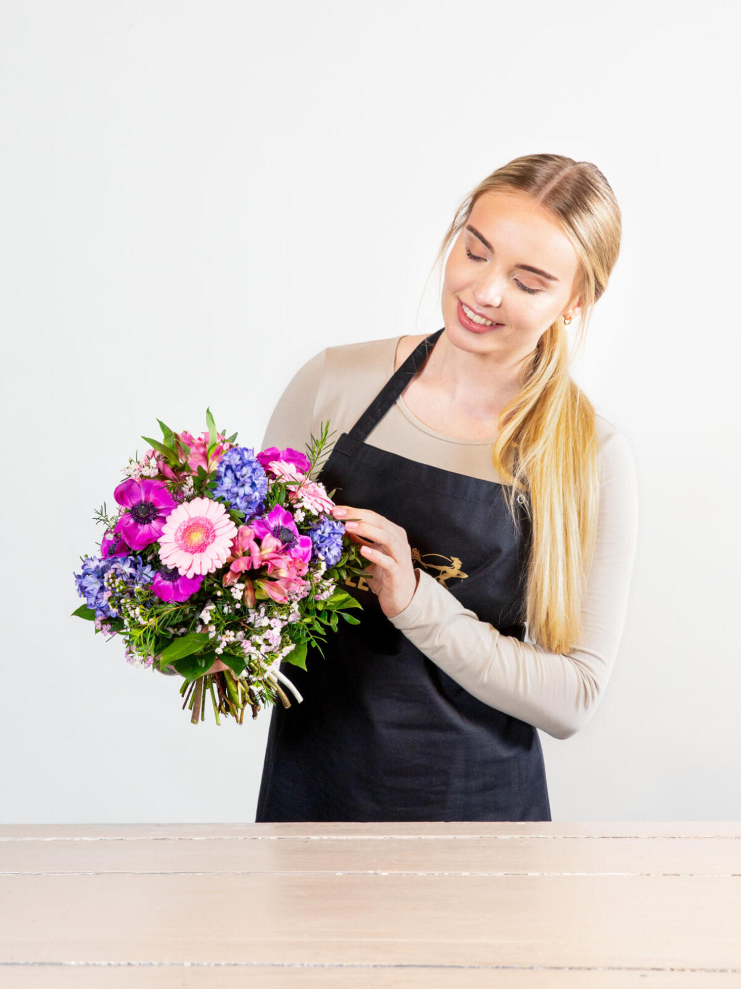 Rund gebundener Strauß in Pink-Rosa-Blau mit Germini, zart duftenden Hyazinthen, Anemonen, Inkalilien (Alstroemeria) und Waxflower. Als Beiwerk werden Salal und Pistazie verwendet.