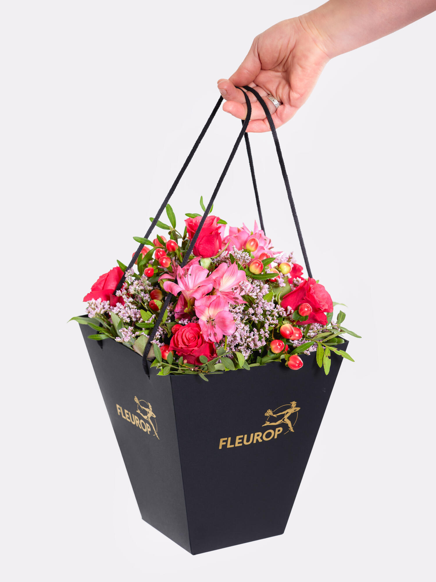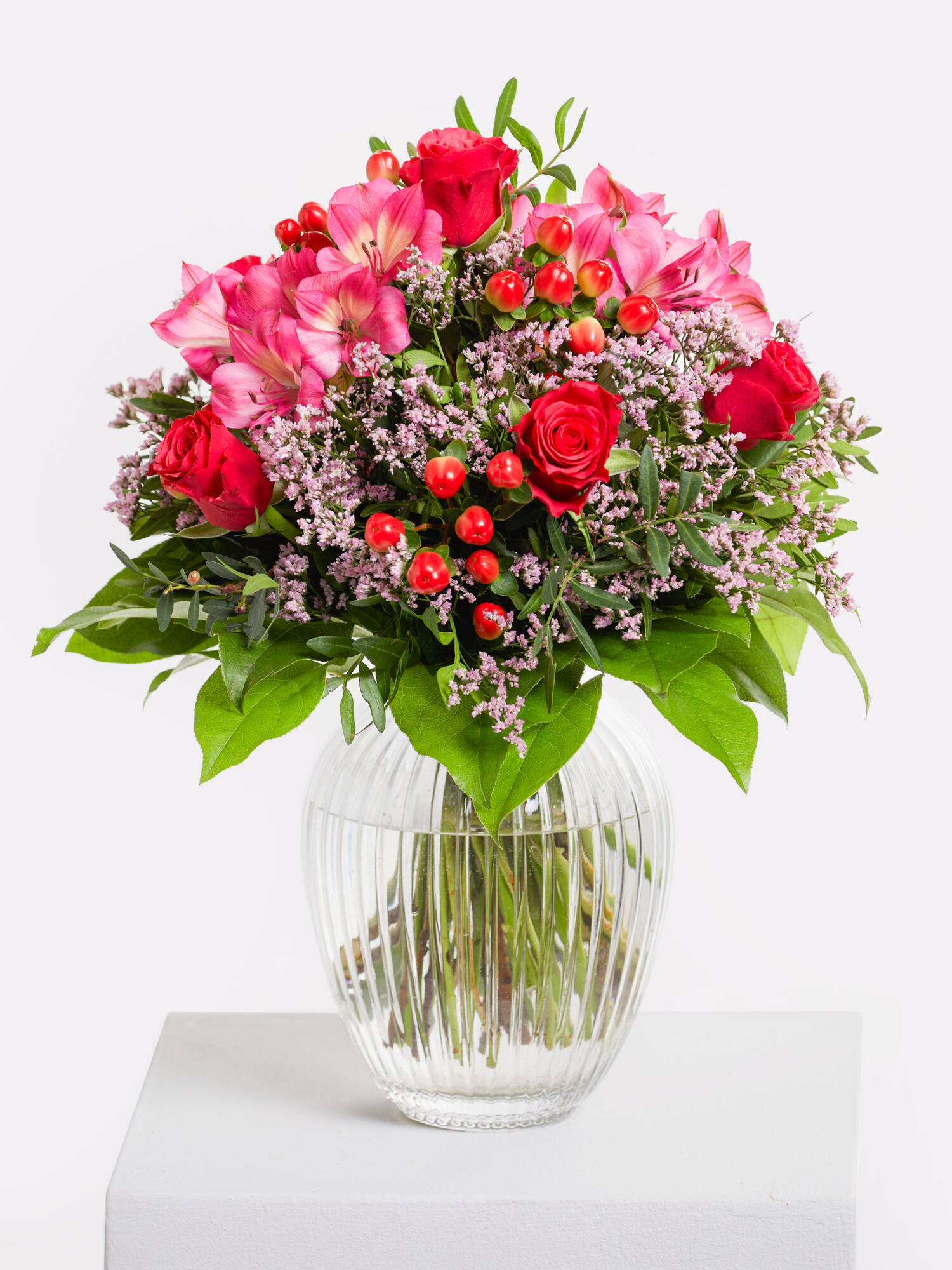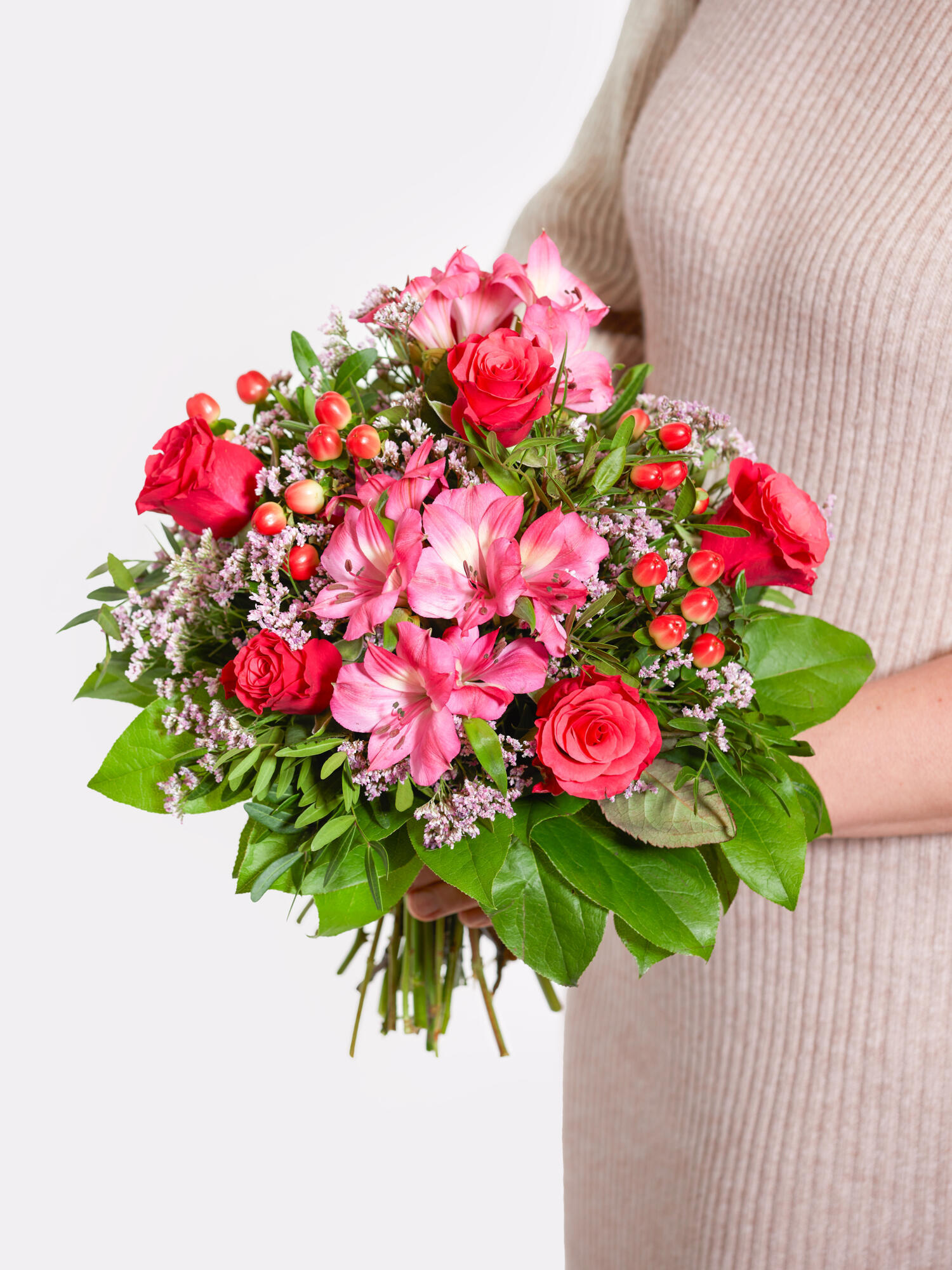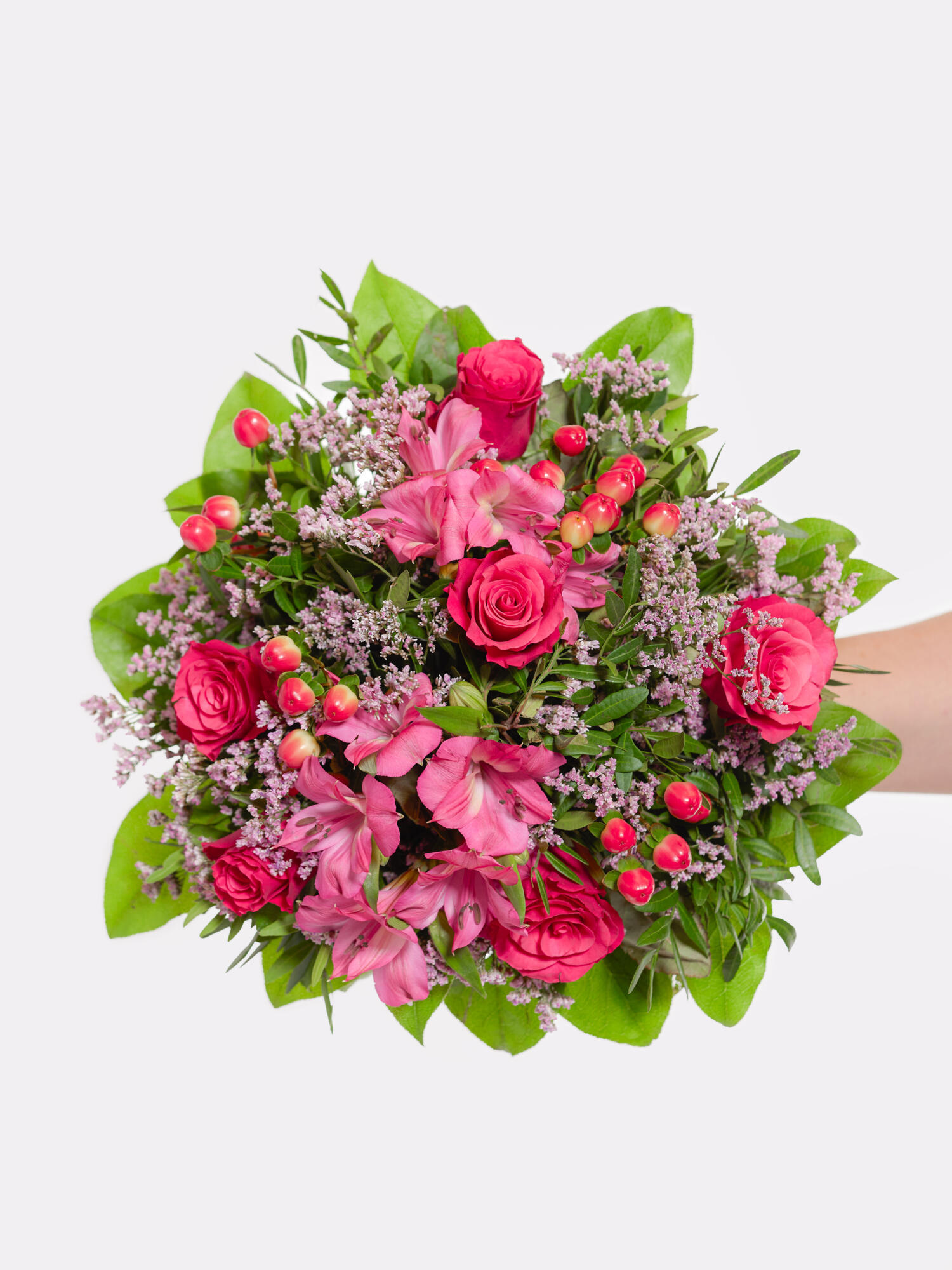Rund gebundener Strauß in Pink-Rosa mit Rosen, Inkalilien (Alstromerien), Strandflieder und rotem Hypericum. Als Beiwerk werden Salal und Pistazie verwendet.