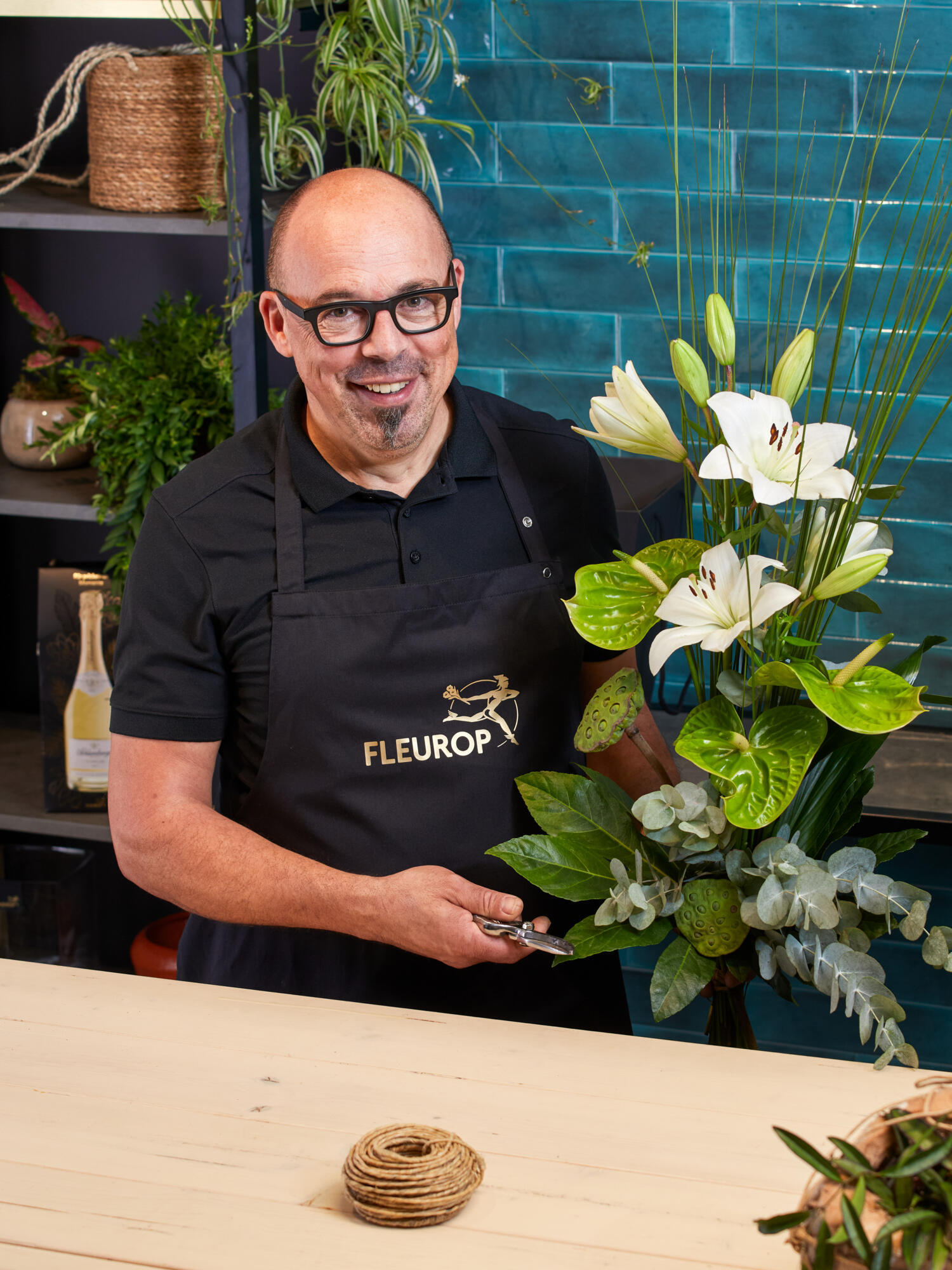 Gestaffelt gebundener Strauß in Weiß-Grün bestehend aus stark duftenden Lilien, Anthurien und Lotus. Als Beiwerk werden Aralie, Aspidistra, Eukalyptus und Steelgras verwendet. Bei geschlossenen Lilien kann das vollständige Aufblühen bis zu 5 Tage dauern.
