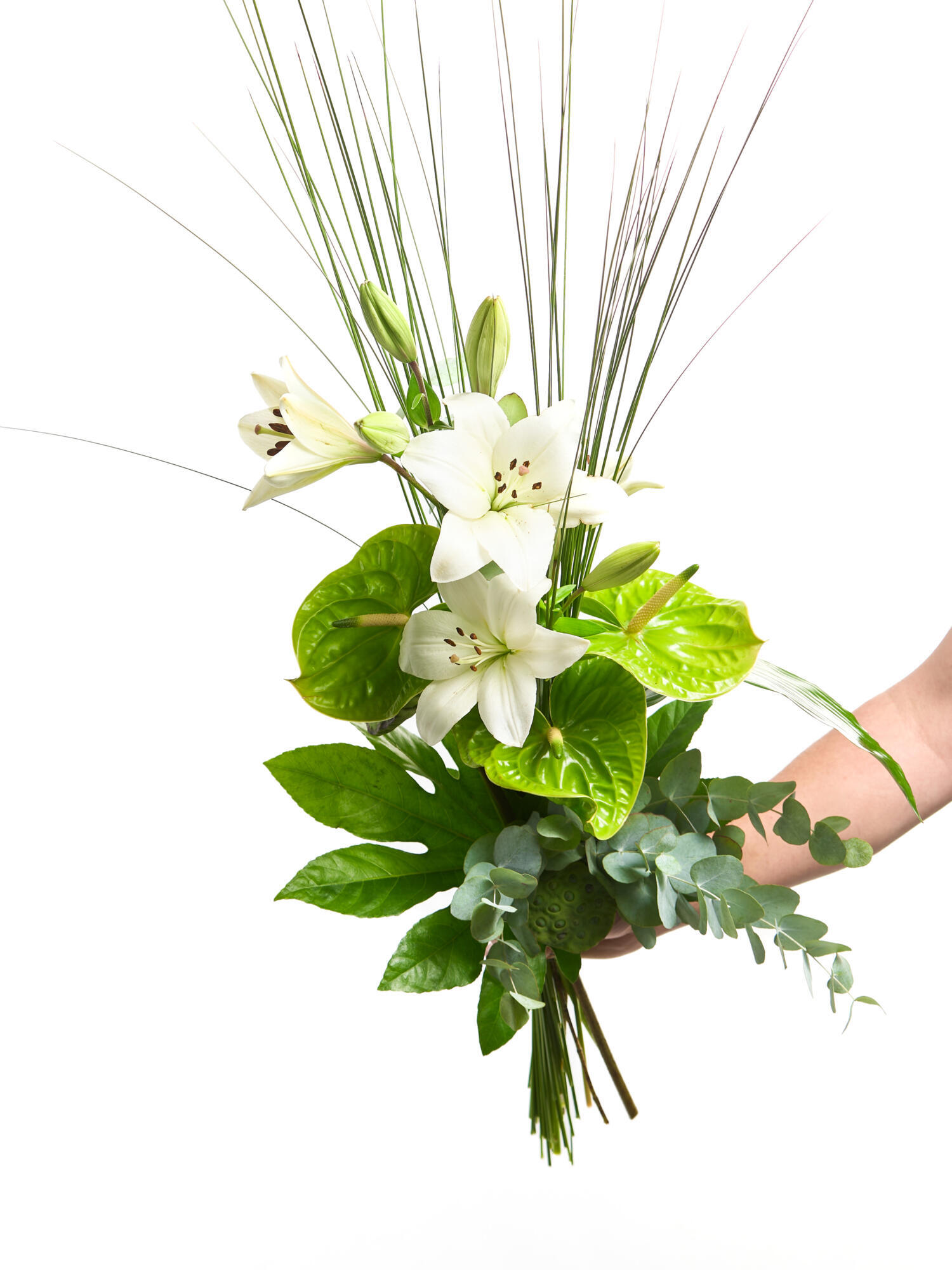 Gestaffelt gebundener Strauß in Weiß-Grün bestehend aus stark duftenden Lilien, Anthurien und Lotus. Als Beiwerk werden Aralie, Aspidistra, Eukalyptus und Steelgras verwendet. Bei geschlossenen Lilien kann das vollständige Aufblühen bis zu 5 Tage dauern.