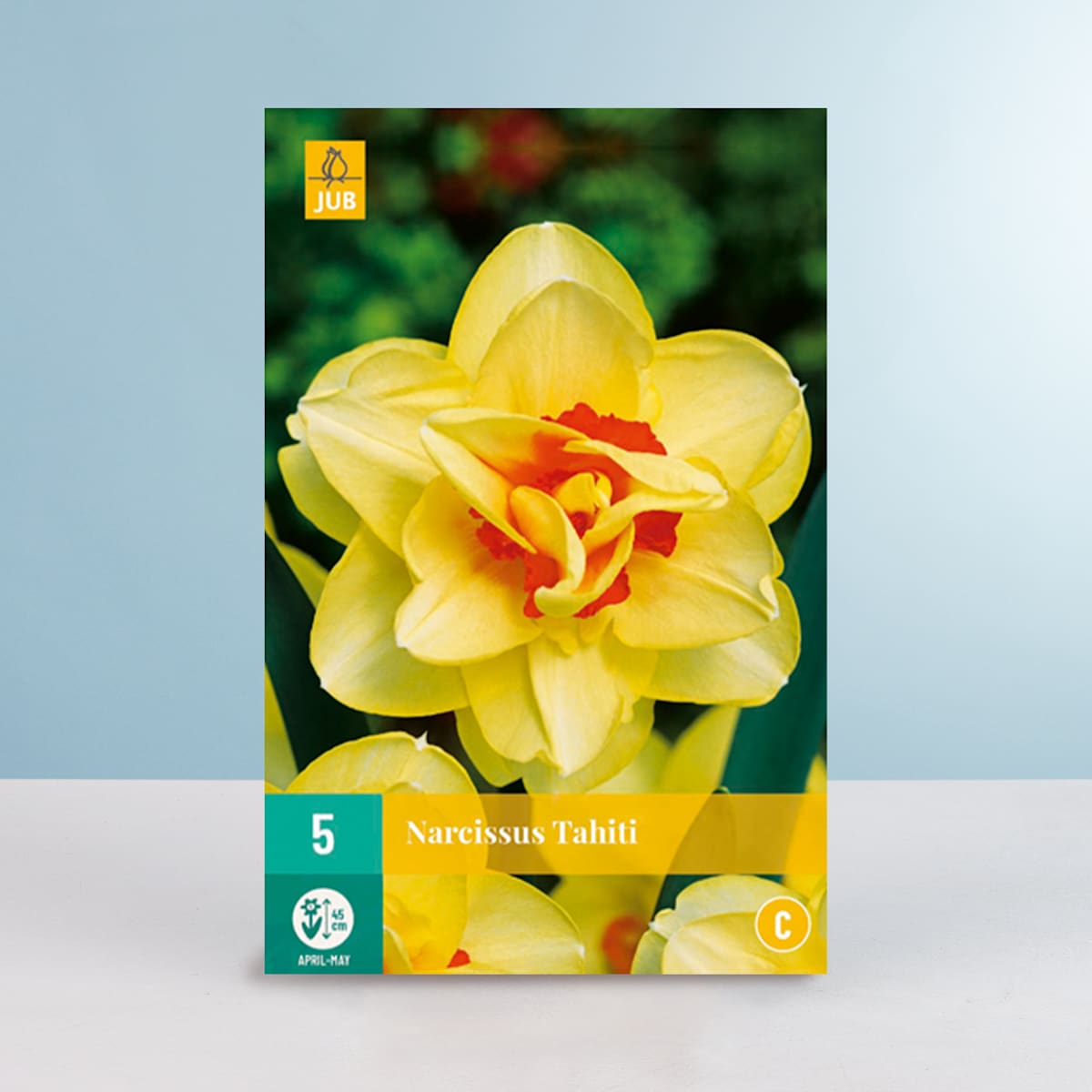 Doch, das ist eine Narzisse, auch wenn die Blüten so speziell aussehen. Die Gefüllte Narzisse ‚Tahiti‘ dachte sich anscheinen: Immer nur Gelb ist langweilig, da peppe ich meine Blüten doch noch mit etwas orange auf. Und so sorgt sie ab März mit ihren gefüllten, gelb-orangefarbenen Blüten für Hingucker. Dabei ist es dieser etwa 40 cm hoch und 20 cm breit werdenden Vertreterin der Art Narcissus Hybrid auch egal, ob du die 5 Zwiebeln, die du erhältst, jetzt ins Beet, in deinen Blumenkübel oder den Balkonkasten pflanzt. Solange sie einen windgeschützten, sonnigen Standort bekommt, ist sie zufrieden.