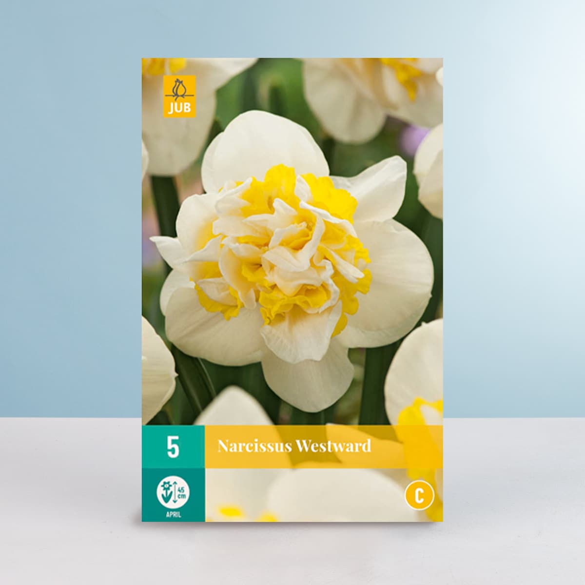 Sieht aus wie eine Narzisse, aber irgendwie anders. Irgendwie nicht ganz gelb aber auch nicht ganz weiß. Und dann diese bauschige, gefüllte Blütenform! Tja und genau das ist es, was die Gefüllte Narzisse ‚Westward‘ ausmacht. Ab März zieht sie mit diesen faszinierenden Blütenkunstwerken die Blicke auf sich. Dabei ist es dieser etwa 40 cm hoch und 15 cm breit werdenden Vertreterin der Art Narcissus Hybrid auch egal, ob du die 5 Zwiebeln, die du erhältst, jetzt ins Beet, in deinen Blumenkübel oder den Balkonkasten pflanzt. Solange sie einen windgeschützten, sonnigen Standort bekommt, ist sie zufrieden.