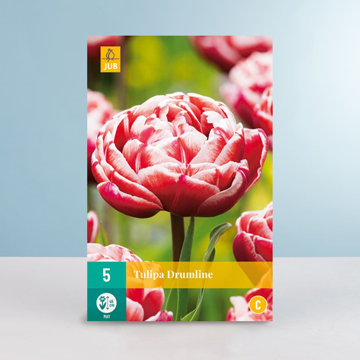 Darf es ein bisschen mehr sein? Aber natürlich! Und deshalb bringt die Gefüllte späte Tulpe ‚Drumline‘, wenn sie von April bis Mai blüht auch nicht nur einfach rote Tulpenblüten hervor. Sie füllt sie mit ein paar extra Blütenblättern und lässt die rote Farbe zum Rand hin in weiß übergehen. Nur ein bisschen mehr eben, aber ein echter Wow-Effekt! Mit ihren bis zu 50 cm Wuchshöhe ist sie so ein echter Blickfang in deinen Beeten oder Blumenkübeln. Lass dir diese Vertreterin der Art Tulipa Hybrid also nicht entgehen. Du findest bestimmt noch ein sonniges Plätzchen mit durchlässiger Erde, an das du die 5 Zwiebeln, die du erhältst, pflanzen kannst.