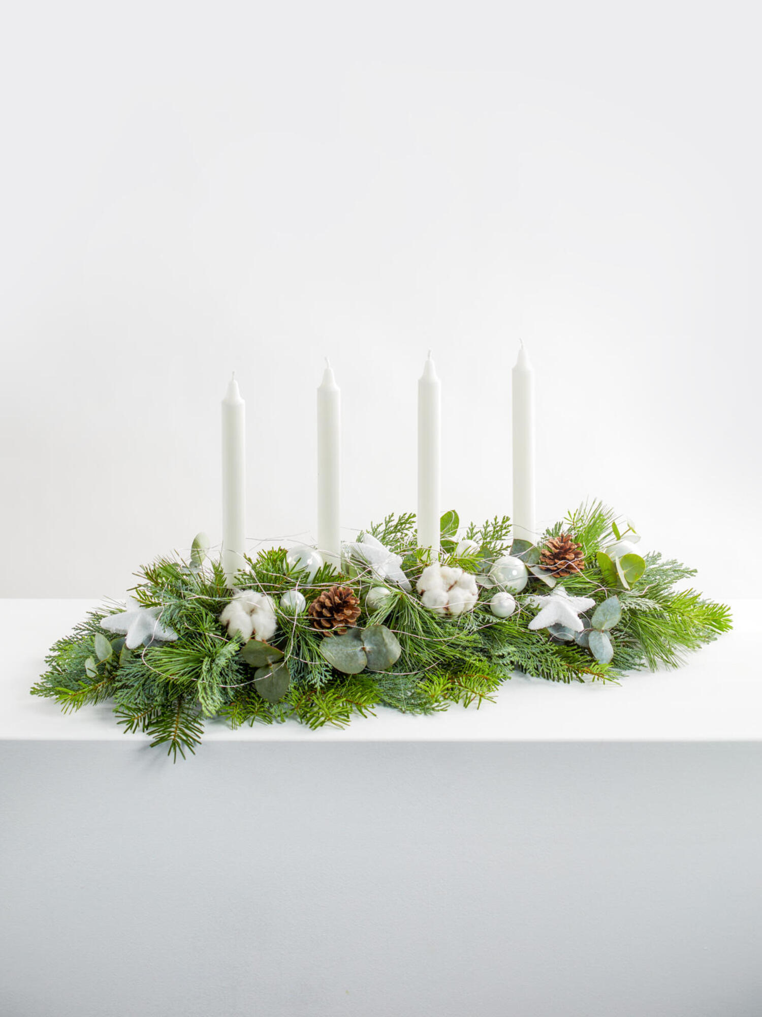 Adventsgesteck in Weiß mit 4 Stabkerzen, Baumwolle, Zapfen, weißen Weihnachtskugeln aus Glas, weißen Dekosternen, Silberdraht sowie Eukalyptus, Koniferen-, Kiefer- und Nordmanntannenzweigen. Länge ca. 48 cm.