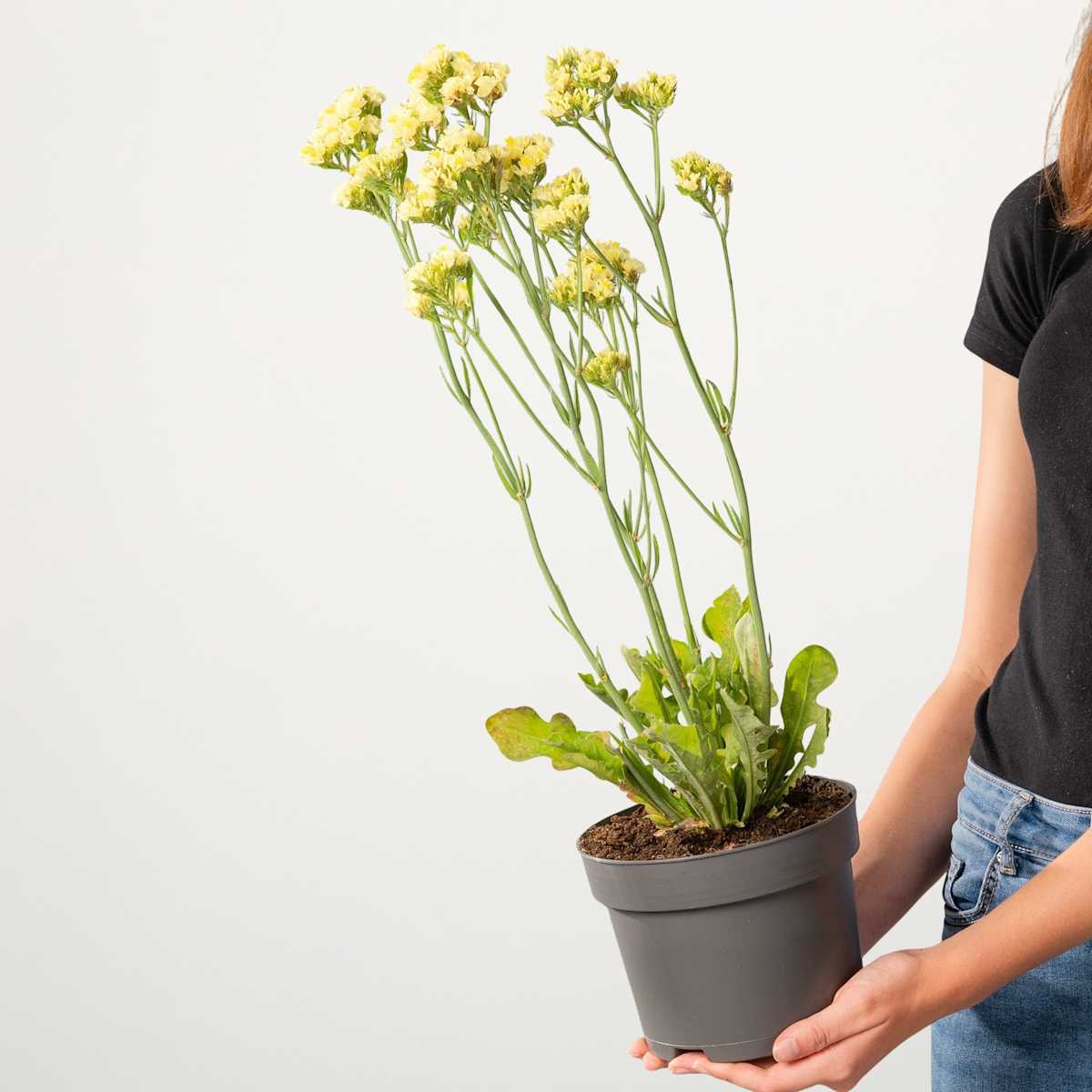 Limonium sinuatum, das hat mit Limonen nichts zu tun, aber mit Mittelmeer und schicken gelben Blüten. Limonium sinuatum ist der botanische Name für den Gelben Strandflieder, einer etwa 50 cm groß und 30 cm breit werdenden Pflanze, deren Heimat in der Mittelmeerregion zu finden ist. Du kannst sie ins Beet pflanzen, aber auch auf deinem Balkon für etwas Mittelmeerfeeling sorgen. Von Juli bis September schmückt sich der Gelbe Strandflieder mit seinen herrlichen gelben Blüten. Also Strandmatte raus und ab an deinen ganz persönlichen Strand.Ausreichend Wasser, dazu ein sonniger Standort, mehr braucht der Gelber Strandflieder nicht um munter zu wachsen und dich mit Blüten zu verwöhnen.