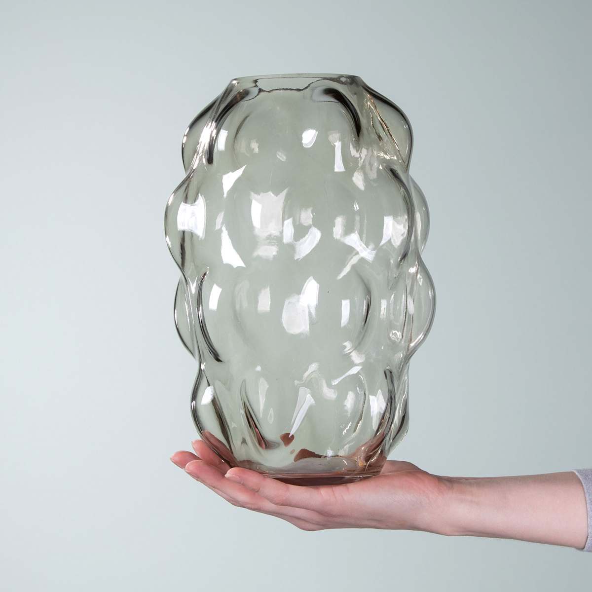 Du liebst aufregende Tasterfahrungen und verweilst gern länger in der pflanzlichen Wahrnehmungswelt? Dann genieße das Aufliegen deiner sensiblen Hände auf dieser Bubble-Glasvase in Grün. Für dieses Erlebnis würdest nicht nur du fast alles geben. Auch deine Frischblumen profitieren von der hügligen Besonderheit dieser 30 cm hohen Glasvase. Viel belebter und ungezügelter verweilen deine Blümchen so in deiner Nähe. Und wenn du ein richtiges Gefühlserlebnis für alle Beteiligten schaffen willst, dann fülle diese Glasvase mit gefärbtem Wasser. Darin rasten die kribbligen Sauerstoffproduzenten völlig aus.
