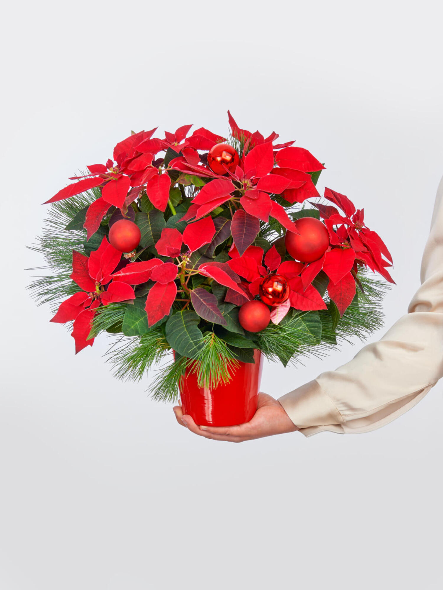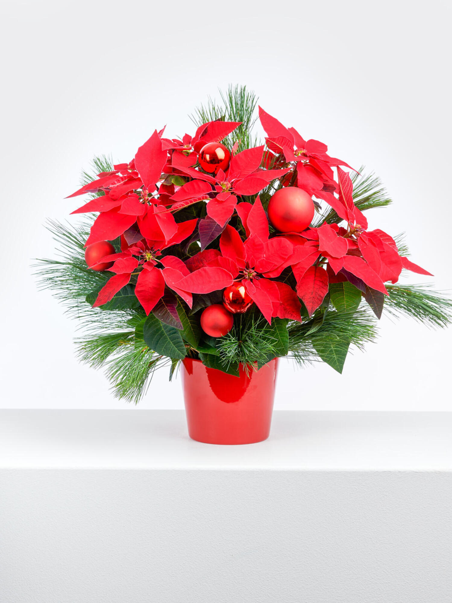 Roter Weihnachtsstern in rotem Übertopf (12 cm) geschmückt mit roten Weihnachtskugeln aus Glas sowie Koniferen- und Kiefernzweigen.