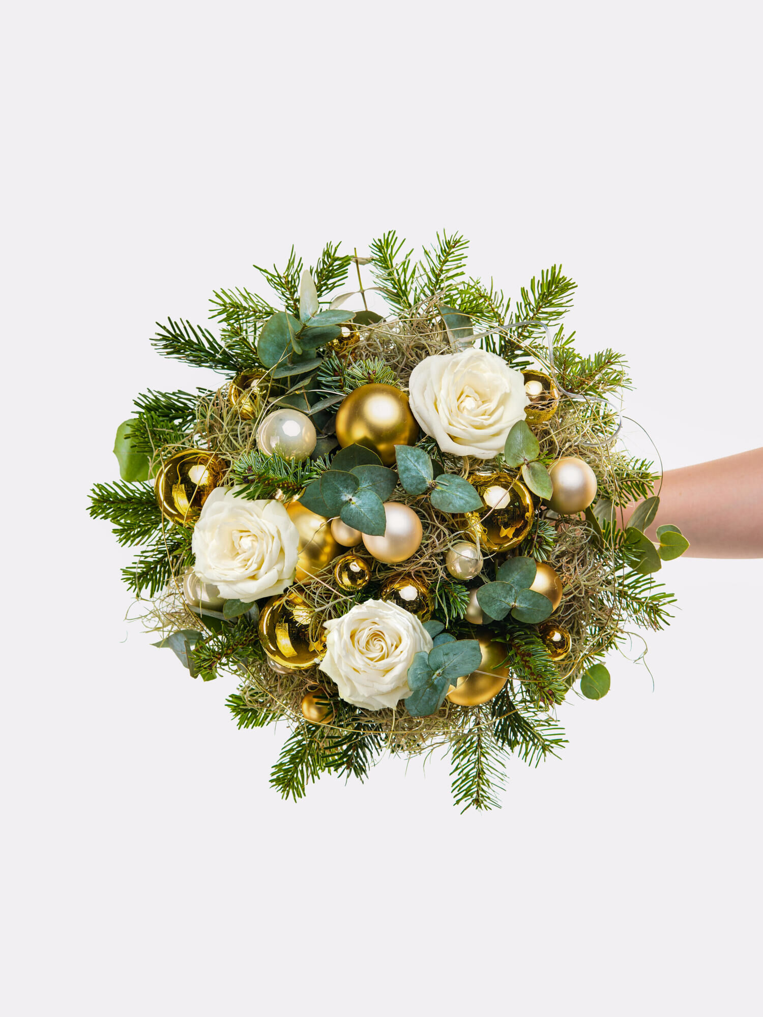 Den festlichen Rosenstrauß „Goldene Weihnachtsträume“ verschicken mit dem Fleurop Blumenversand. ➤ Jetzt online bestellen!