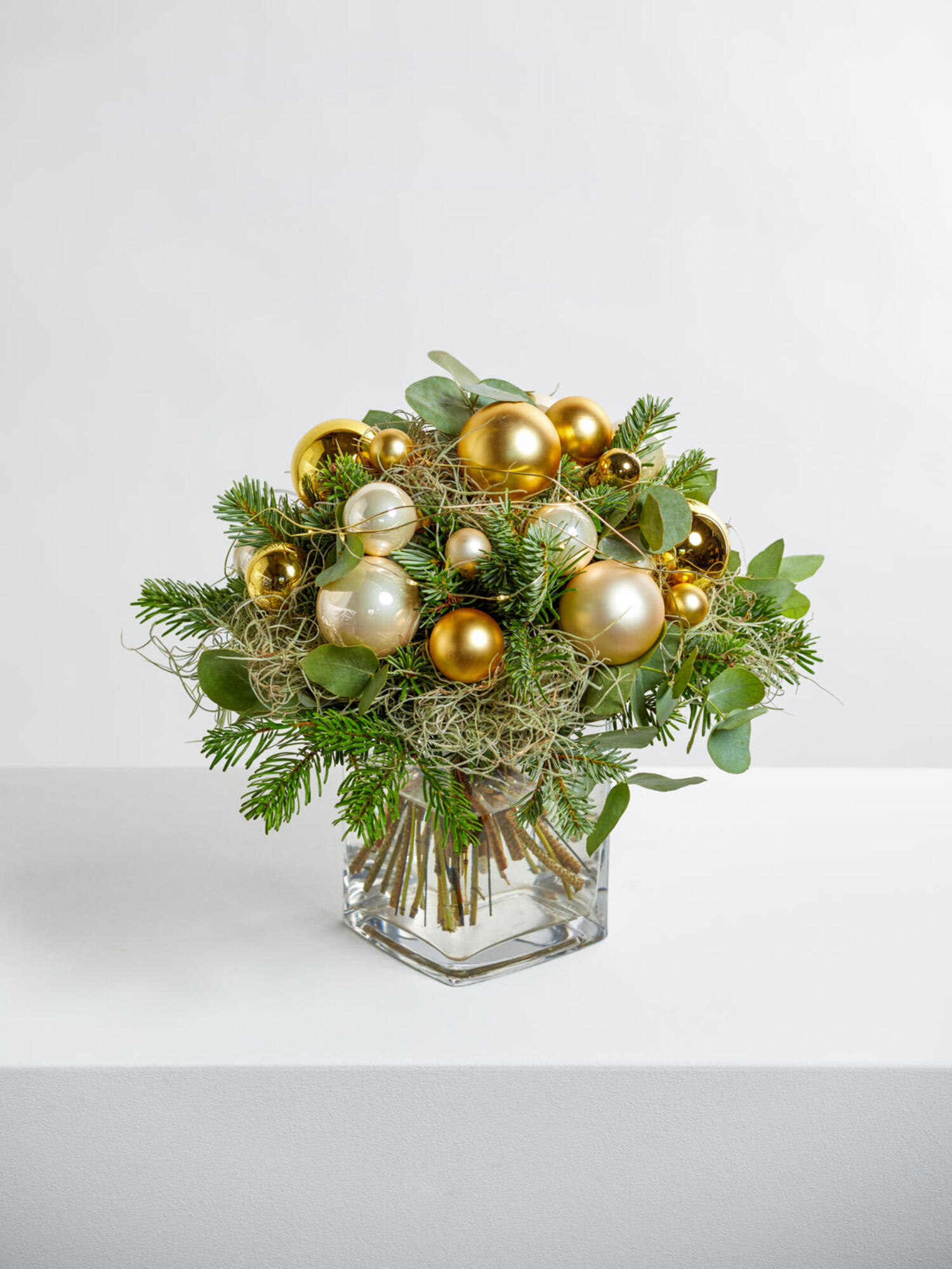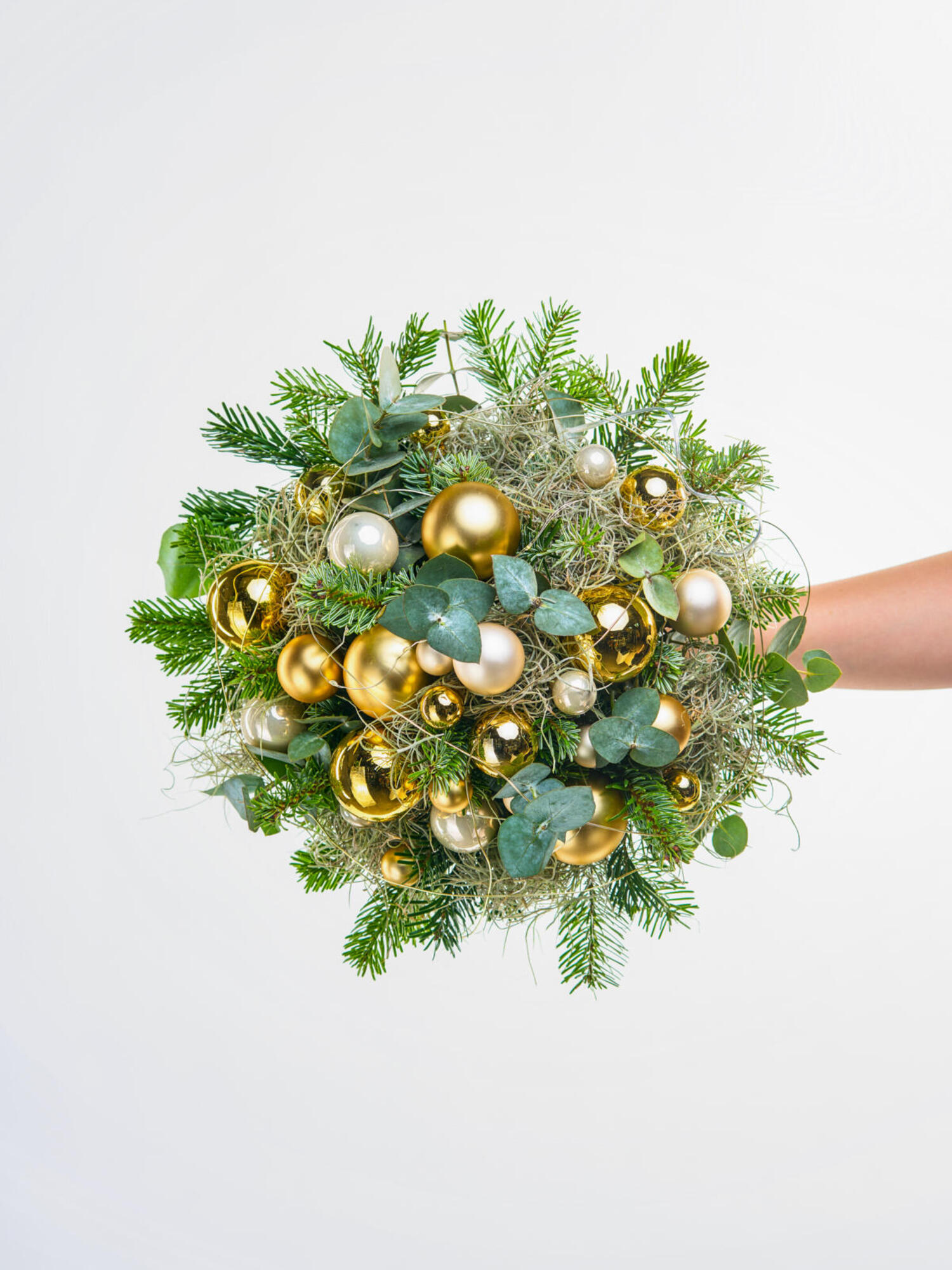 Weihnachtlicher Strauß in Weiß-Gold-Grün mit weißen Rosen, Eukalyptus, Tanne, goldenen und cremefarbenen Weihnachtskugeln aus Glas, Golddraht, Lichterkette und Tillandsia.