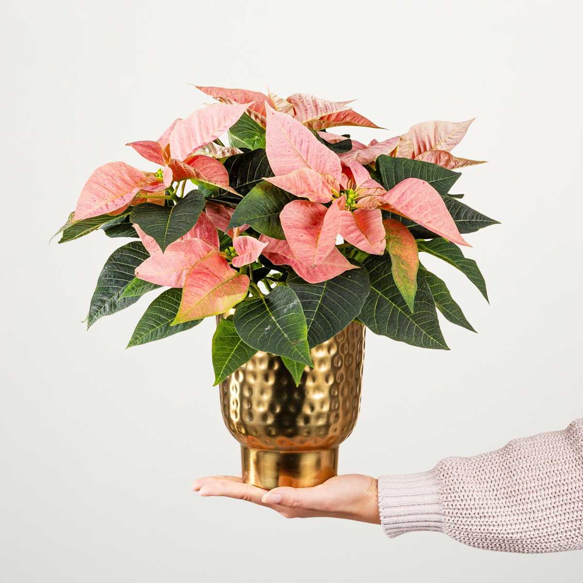 Der Weihnachtsstern mit seinen farbenfrohen Hochblättern zählt in der Vorweihnachtszeit zu den absoluten Lieblingen in jedem Haus. Unser Weihnachtsstern Goldzauber präsentiert sich mit dunkelgrünem Blattwerk und dekorativen Blättern in zartem Apricot. Er hat eine Wuchshöhe von ca. 35 cm und erreicht den Empfänger inklusive schönem Übertopf aus Metall. Die Topfgröße beträgt ca. 13 cm. Die frostempfindliche Zimmerpflanze liebt einen mäßig trockenen Wurzelbereich und einen halbsonnigen Standort ohne Zugluft. Ursprünglich stammt der Weihnachtsstern, der auch unter den Bezeichnungen Christstern und Poinsettie bekannt ist, aus Südamerika. So kann Weihnachten kommen.