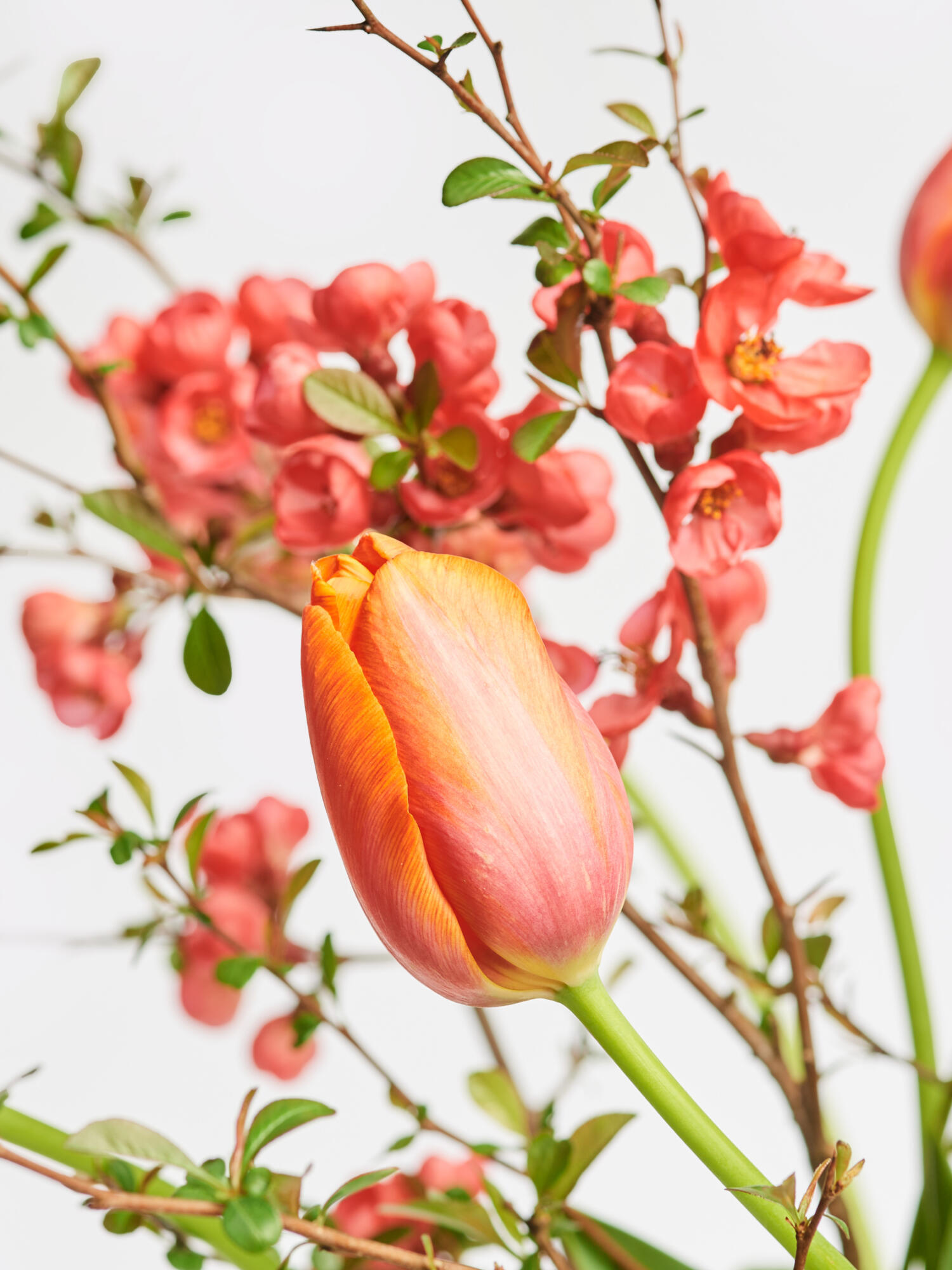 Lang gebundener Strauß in Apricot-Grün mit französischen Tulpen, Schneeball und blühenden Quittenzweigen. Auf Beiwerk wird verzichtet.