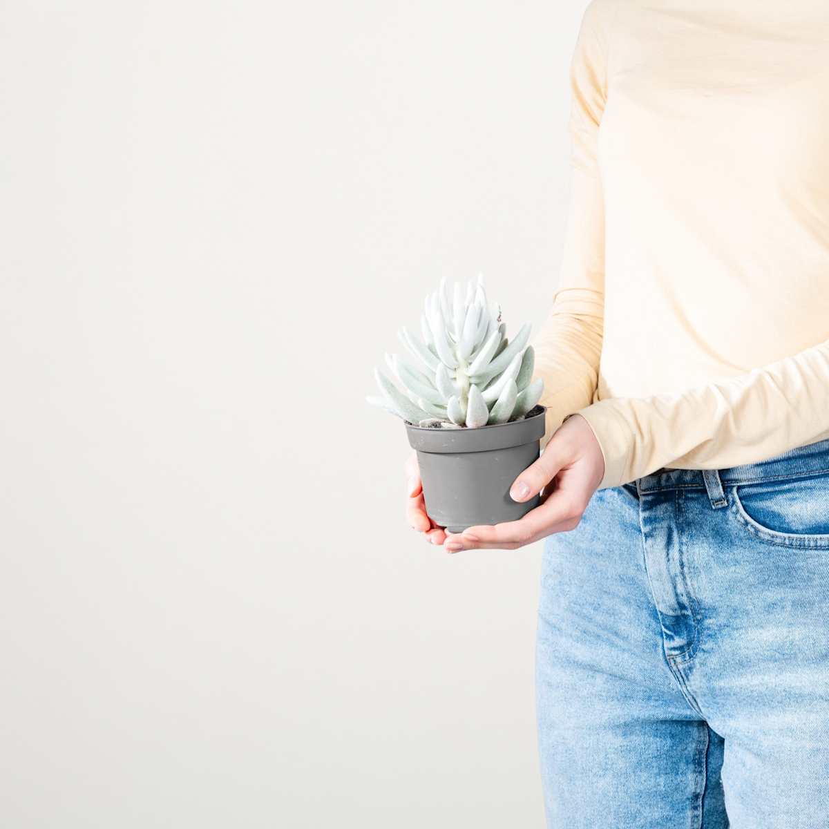 Das Greiskraut ‚Mont Blanc‘ ist eine ganz besondere Vertreterin aus der Art Senecio haworthii. Klar, bei dem Aussehen. Die dickfleischigen, fingerartigen Blätter haben eine ganz spezielle silberweiße Farbe und – anfassen erlaubt! – sind dezent flauschig. Durch den aufrechten Wuchs, dieser auch als Kreuzkraut bekannten Zimmerpflanze ergibt sich so ein einzigartiger Look. Das Greiskraut ‚Mont Blanc‘ muss regelmäßig gegossen werden. Wenn du darauf achtest, dass die Erde immer leicht feucht ist, belohnt es dich mit kräftigem Wuchs. Am besten kann es das an einem hellen Standort. Die pralle Sonne mag es nicht so gerne.