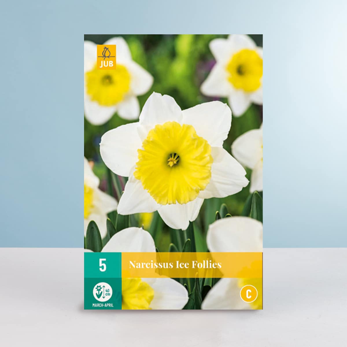Ob sie wohl friert? Zwischen März und April kann es ja noch manchmal recht frisch werden. Oder ist es eine vornehme Blässe, die sie zeigt? Nein, die Großkronige Narzisse ‚Ice Follies‘ mag einfach frische Frühlingspastellfarben. Und so schmückt sie ihre weiße Blüte mit einer zartgelben Krone. Steht ihr wirklich ausgezeichnet und passt bestimmt auch in deinen Garten! Diese Vertreterin der Art Narcissus Hybrid wird dabei etwa 40 cm hoch. Du kannst die 5 Zwiebeln, die du erhältst, in deine Beete pflanzen, aber auch in Kübel auf Balkon oder Terrasse. Hauptsache die Erde ist durchlässig und der Standort windgeschützt und sonnig.