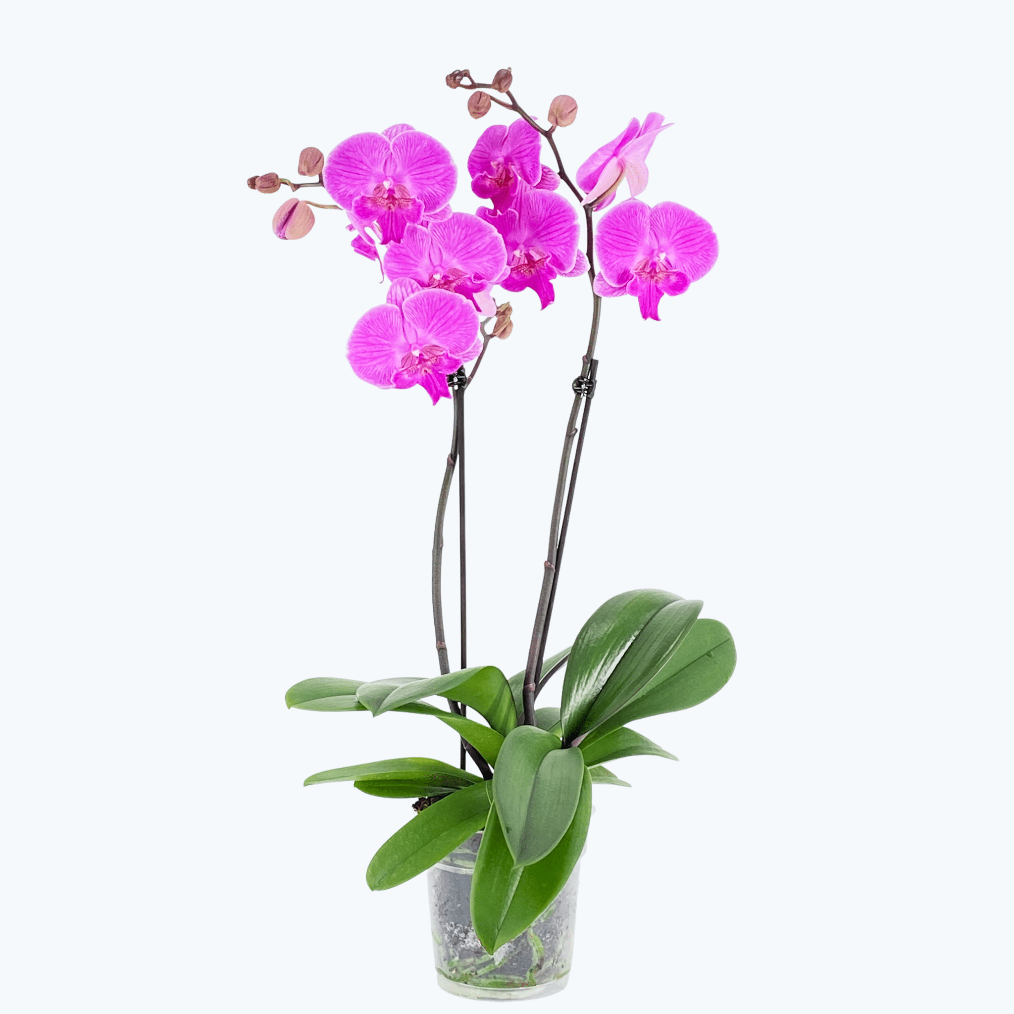 Die Two of Us Manta Kalimantan gehört zu den großblumigen Big Lip-Sorten. Sie zeichnet sich durch besonders langlebige Blüten, kräftiges Wachstum und stabile Stiele aus, die zahlreiche große Blüten tragen. Gezüchtet wurde diese Sorte von der niederländischen Firma Anthura in Bleiswijk, einem der führenden Zuchtbetriebe für Orchideen. Big Lip-Sorten sind erst seit kurzer Zeit auf dem Markt und derzeit nur in begrenzter Stückzahl erhältlich. Das Manta-Sortiment überzeugt durch sehr gute Haltbarkeit und gesundes Wachstum. Schon gewusst? Bei Two of Us-Orchideen pflanzen wir zwei Jungpflanzen in einem Topf an, sodass du eigentlich sogar zwei Pflanzen erhältst. Jede von ihnen hatte viel Zeit, in unserer Gärtnerei in Ruhe gesund aufzuwachsen.