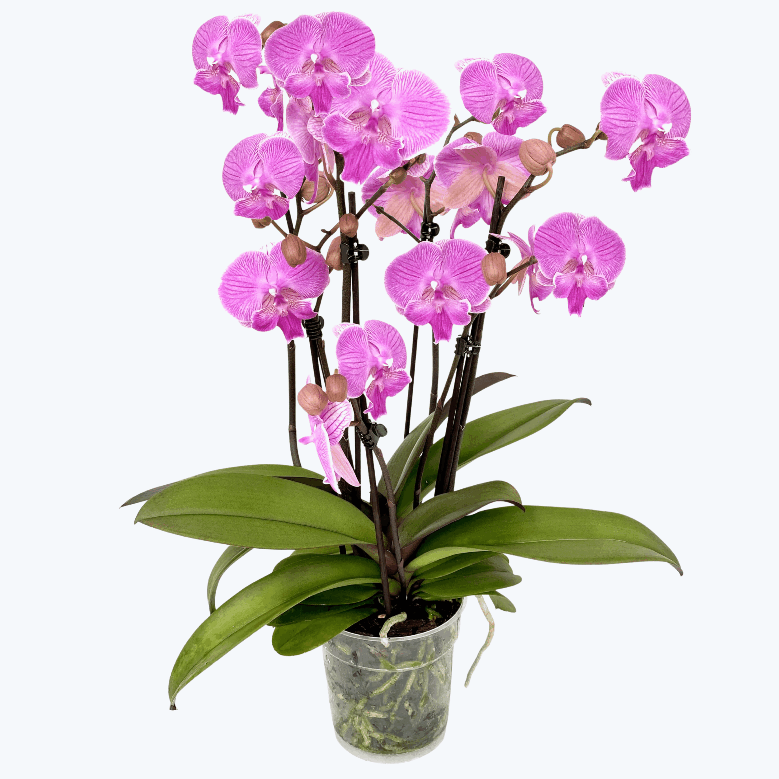 Die Two of Us Manta Kalimantan trägt große, pinkfarbene Blüten mit einer breiten Lippe. Die Einzelblüten öffnen sich vollständig zu einer runden Scheibenform. Die Pflanzen selbst bleiben kompakt und eignen sich dadurch gut für kleinere Stellflächen. Gezüchtet wurde diese Sorte von der niederländischen Firma Anthura in Bleiswijk, einem international tätigen Zuchtbetrieb. Das Manta-Sortiment gehört zu den neueren Entwicklungen im Bereich der Big-Lip-Orchideen und ist aktuell nur in begrenzter Stückzahl erhältlich. Es zeichnet sich durch eine lange Blühdauer und gesundes Wachstum aus. Schon gewusst? Bei Two of Us-Orchideen pflanzen wir zwei Jungpflanzen in einem Topf an, sodass du eigentlich sogar zwei Pflanzen erhältst. Jede von ihnen hatte viel Zeit, in unserer Gärtnerei in Ruhe gesund aufzuwachsen.
