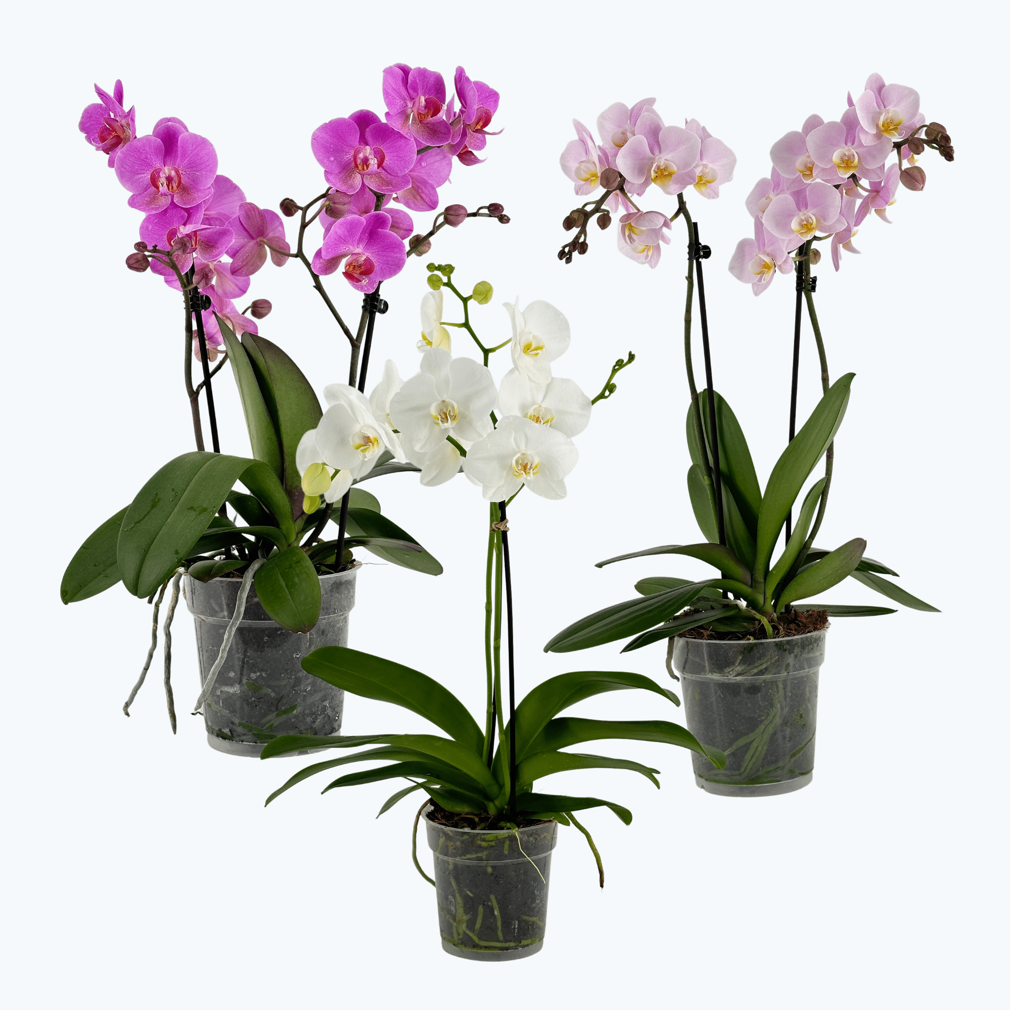 Mit diesem Set erhältst du 3 prächtige Orchideen in verschiedenen Farben im 12 cm Topf mit jeweils 2 Rispen. Wir haben immer wieder kleine Partien mit Testsorten mit 2 Blütenstielen pro Topf. Diese schönen Pflanzen bieten wir dir hier dann gern zum attraktiven Preis an! Die Pflanzen unserer Farbmix-Sets sind allesamt haltbare Sorten von hervorragender Qualität. Sie hatten viele Monate Zeit, in unserer Gärtnerei aufzuwachsen, um groß und kräftig zu werden. Hinweis: Die Farbe und Größe der einzelnen Blüten sowie die Rispenhöhe der Orchideen fallen in der Zusammenstellung unserer Farbmix-Sets stets unterschiedlich aus – die hier gezeigten Orchideen sind nur Beispielfotos. Wenn du spezielle Farbwünsche hast, schreiben uns deinen Farbwunsch gern in das Hinweisfeld in deinem Warenkorb. Im Überblick: 2 Blütenrispen Topfgröße: 12 cm Größe: ca. 45 – 70 cm