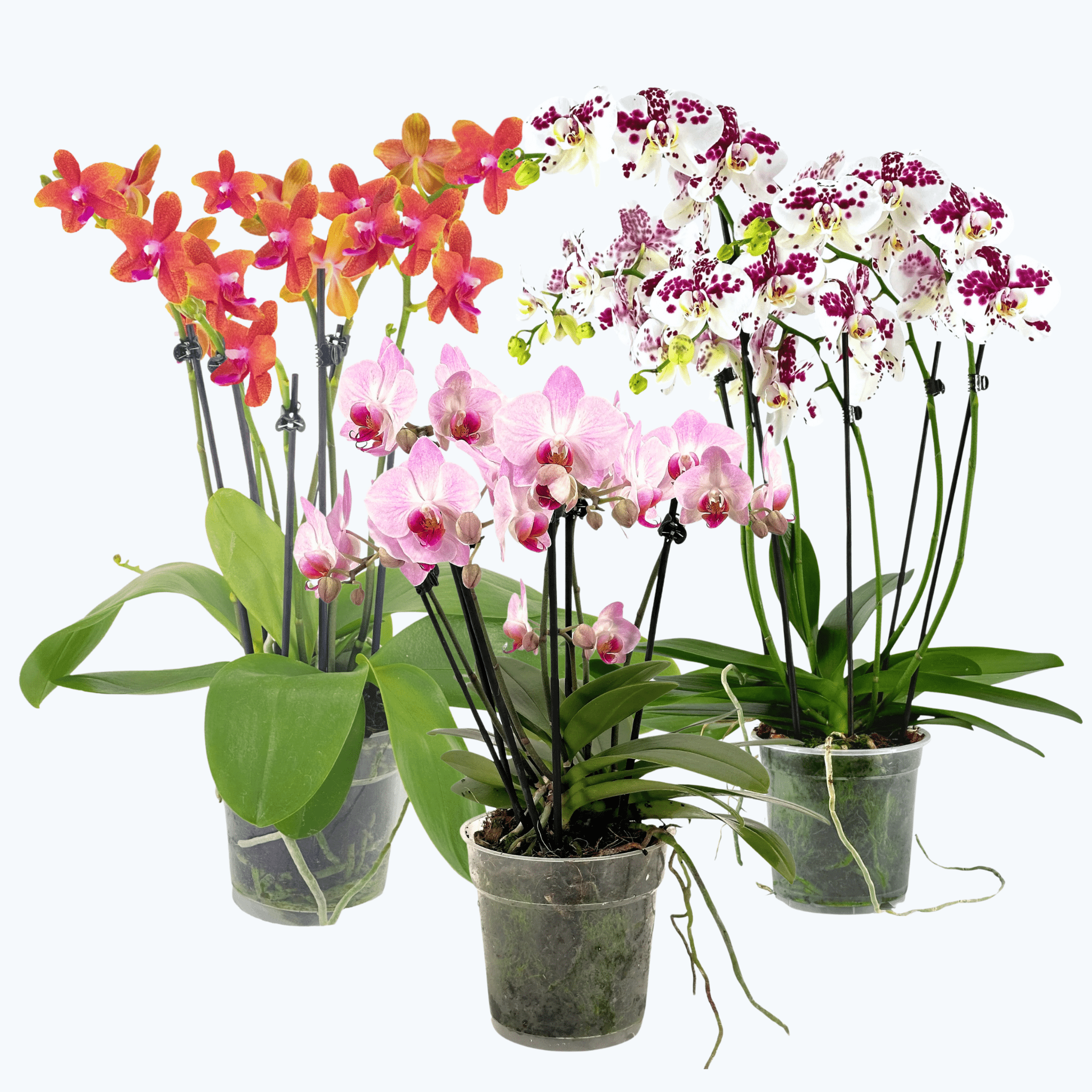 Mit diesem Set erhältst du 3 große Two of Us Orchideen im 12 cm Topf mit jeweils 5 Rispen zu einem absolut attraktiven Preis! Die Pflanzen unserer Farbmix-Sets sind allesamt haltbare Sorten von hervorragender Qualität. Sie hatten viele Monate Zeit, in unserer Gärtnerei aufzuwachsen, um groß und kräftig zu werden. Hinweis: Die Farbe und Größe der einzelnen Blüten sowie die Rispenhöhe der Orchideen fallen in der Zusammenstellung unserer Farbmix-Sets stets unterschiedlich aus – die hier gezeigten Orchideen sind nur Beispielfotos. Wenn du spezielle Farbwünsche hast, schreibe uns deinen Farbwunsch gern in das Hinweisfeld in deinem Warenkorb. Im Überblick: 5 Blütenrispen Topfgrößen: 12 cm Größe: ca. 45 – 70 cm