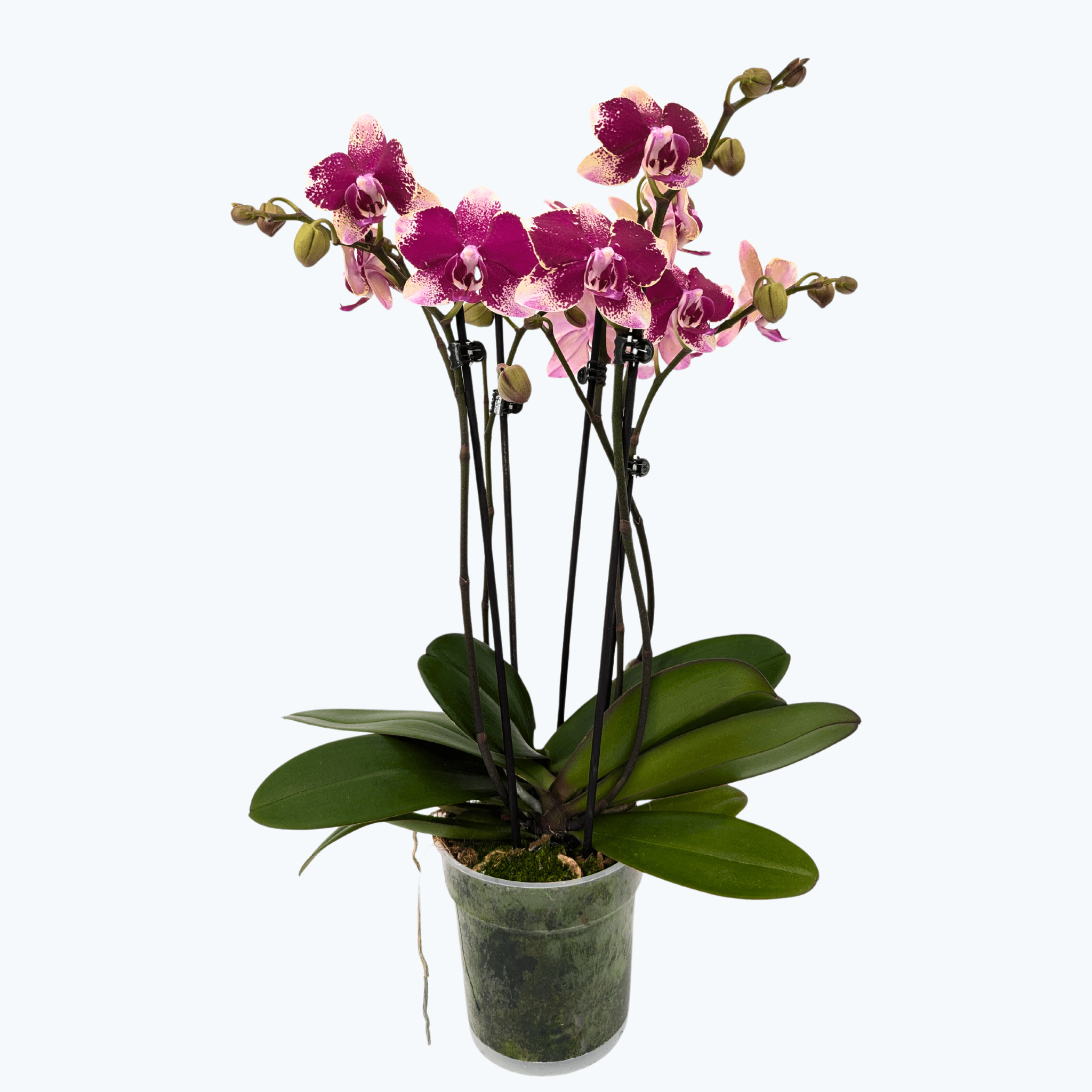 Entdecke die Two of Us Rombley – eine Phalaenopsis, die mit ihren intensiven Blüten sofort ins Auge fällt. Das kräftige Magentarot mit dem vanillegelben Rand macht sie zu einem echten Highlight in deinem Zuhause. Ihre Blüten sind nicht nur besonders auffällig, sondern auch besonders langlebig – so hast du lange Freude an ihr. Gezüchtet wurde die Rombley von Anthura in den Niederlanden, einem der führenden Orchideenzüchter der Welt. Schon gewusst? Bei Two of Us-Orchideen pflanzen wir zwei Jungpflanzen in einem Topf an, sodass du eigentlich sogar zwei Pflanzen erhältst. Jede von ihnen hatte viel Zeit, in unserer Gärtnerei in Ruhe gesund aufzuwachsen.