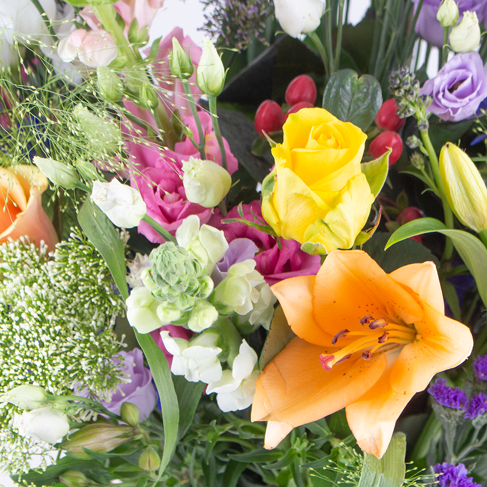 Eine traumhaft bunter, großer Blumenstrauß Unser großer Blumenstrauß Regenbogen vereint alle Farben des Regenbogens und wird dadurch zum bunten und fröhlichen Blickfang. Die schönsten Blumen wie Nelken, Rosen, Löwenmäulchen und Inkalilien sorgen für einen frischen sommerlichen Look. Der Blumenstrauß eignet sich hervorragend, um einem lieben Menschen eine Freude zu bereiten. Ob zum Geburtstag, zur Geburt des Kindes, als Danksagung oder als Genesungsgruß – Blumen zu jedem Anlass. Übrigens: Hinterlasse dem Empfänger eine liebe Botschaft auf unserer kostenlosen Grußkarte, um dein Überraschungspaket zu vervollständigen.