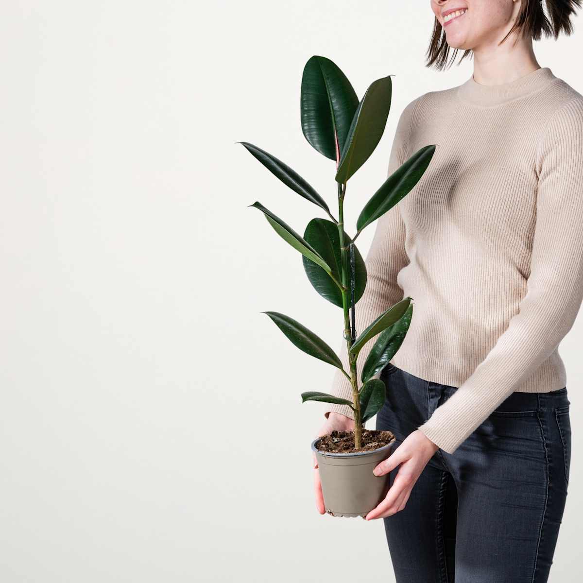 Vertreter der Art Ficus elastica sind nach wie vor Klassiker unter den Zimmerpflanzen. Da ist es dann auch nicht entscheidend, ob du ihn Gummibaum oder Kautschukbaum nennst. Es gibt sie in so vielen ‚Designs‘. Der Gummibaum ‚Abidjan‘ kommt geradezu elegant daher. Wie einen noblen Anzug trägt er seine großen schwarzgrünen Blätter. Obendrauf glänzen sie, wie frisch poliert, auf der Unterseite sind sie edel mattgrau. Dazu wirken die roten Blattstiele fast schon verwegen. Übrigens kann er bis zu 1,6 m hoch und 1,5 m breit werden. Ein echtes Statement.Der Gummibaum ‚Abidjan‘ muss regelmäßig gegossen werden. Wenn du darauf achtest, dass die Erde immer leicht feucht ist, belohnt er dich mit kräftigem Wuchs. Am besten kann er das an einem hellen Standort. Die pralle Sonne mag er nicht so gerne.