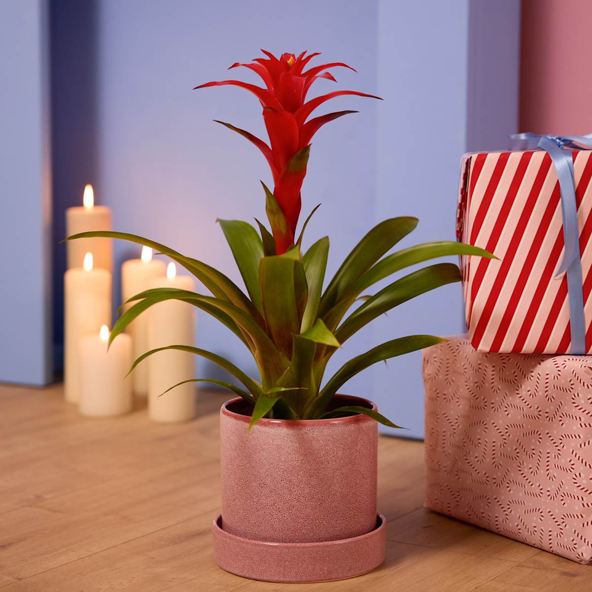 Die Guzmanie ‚Calypso‘ ist eine sprudelnde Quelle purer Lebensfreude! Über einem Wirbel aus hellgrünen, glänzenden Blättern springt lebhaft ihr Blütenschopf in leuchtendem Rot hervor. Und die gute Laune dieser bis zu 80 cm hoch und 40 cm breit werdenden Guzmania ist ansteckend. Übrigens ist sie mit fast jedem Standort fein. Die Guzmanie ‚Calypso‘ muss ausreichend gegossen werden. Wenn du darauf achtest, dass die Erde immer feucht ist, belohnt sie dich mit kräftigem Wuchs. Am besten kann sie das an einem sonnigen bis halbschattigen Standort.