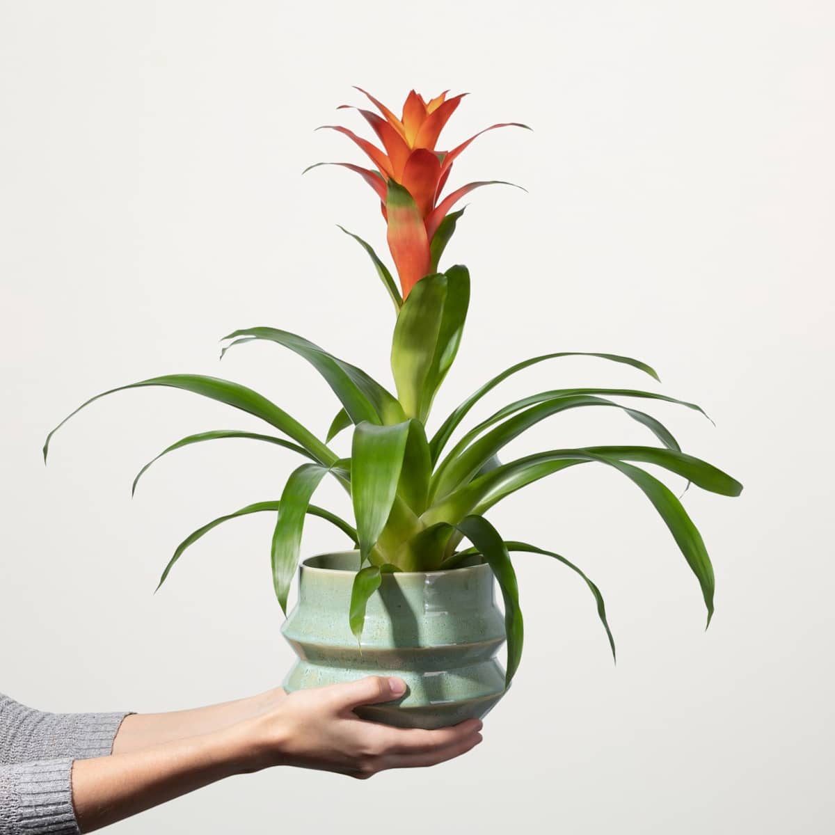 Der leuchtend orangefarbene Blütenschopf der Guzmanie ‚Fiero Orange‘ sticht über der hellgrünen Blattrosette hervor wie ein wahres Freudenfeuer. Und ganz sicher wird auch dir beim Anblick dieser bis zu 80 cm hoch und 40 cm breit werdenden Guzmania ganz warm ums Herz. Übrigens brauchst du dir keinerlei Gedanken über Brandschutzauflagen zu machen, die Guzmanie ‚Fiero Orange‘ ist mit fast jedem Standort fein. Die Guzmanie ‚Fiero Orange‘ muss ausreichend gegossen werden. Wenn du darauf achtest, dass die Erde immer feucht ist, belohnt sie dich mit kräftigem Wuchs. Am besten kann sie das an einem sonnigen bis halbschattigen Standort.