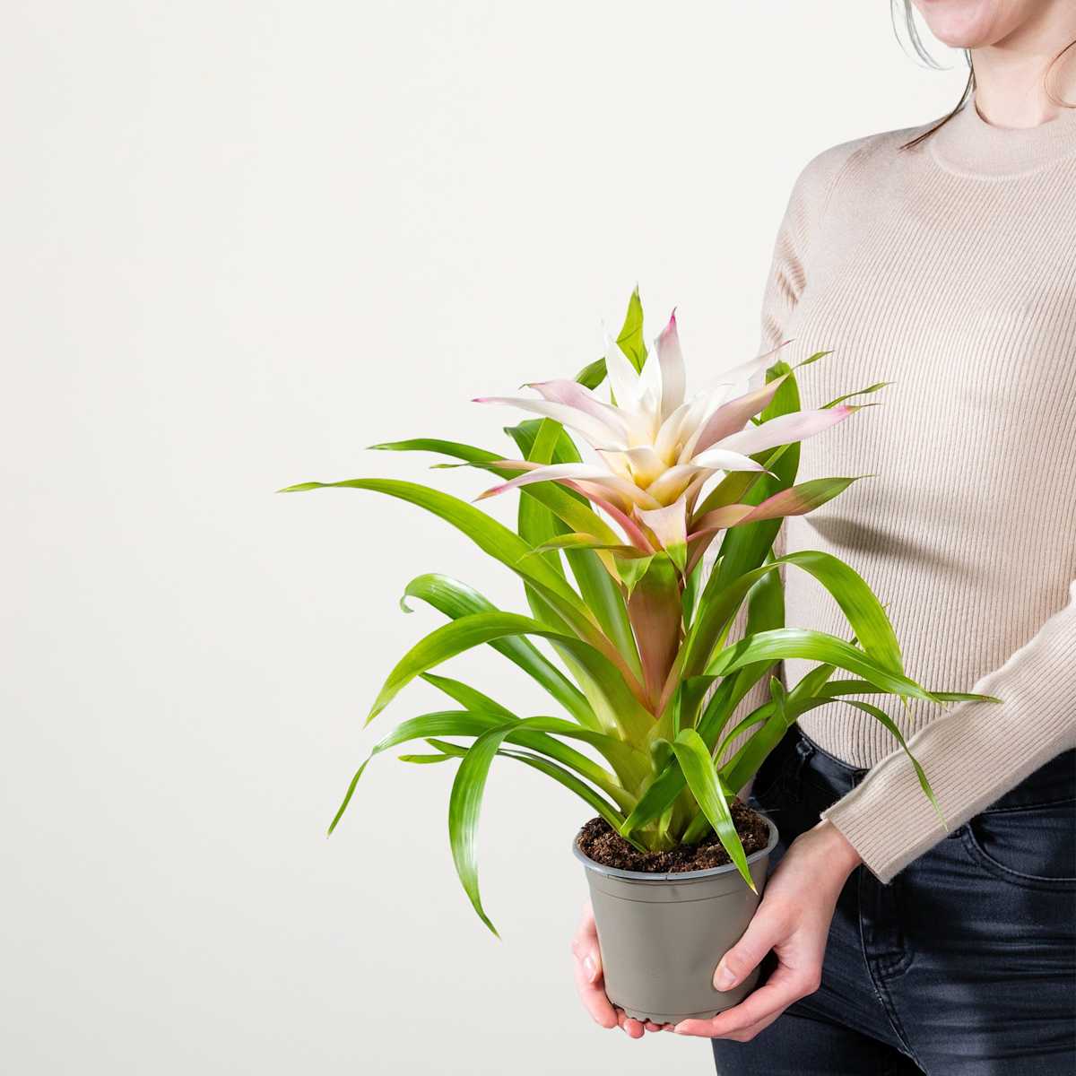 Unter den Guzmannien ist die Guzmania ‚Magical White‘ diejenige mit der edelsten Blüte. Nicht nur erinnert ihr Name ein wenig an eine Disney-Prinzessin, die Blüte selbst sieht auch so aus: Magical White eben, mit einem Hauch Rosa. Zum Tanz auffordern kannst du sie mit ein wenig Bücken auch, denn sie schafft immerhin stolze 80–100 cm. Damit deine Guzmannie lange blüht, darf sie nicht zu kalt stehen. Schließlich ist sie, als echte Tropenpflanze, eben ein Sensibelchen.Die Guzmania ‚Magical White‘ muss ausreichend gegossen werden. Wenn du darauf achtest, dass die Erde immer feucht ist, belohnt sie dich mit kräftigem Wuchs. Am besten kann sie das an einem sonnigen bis halbschattigen Standort.