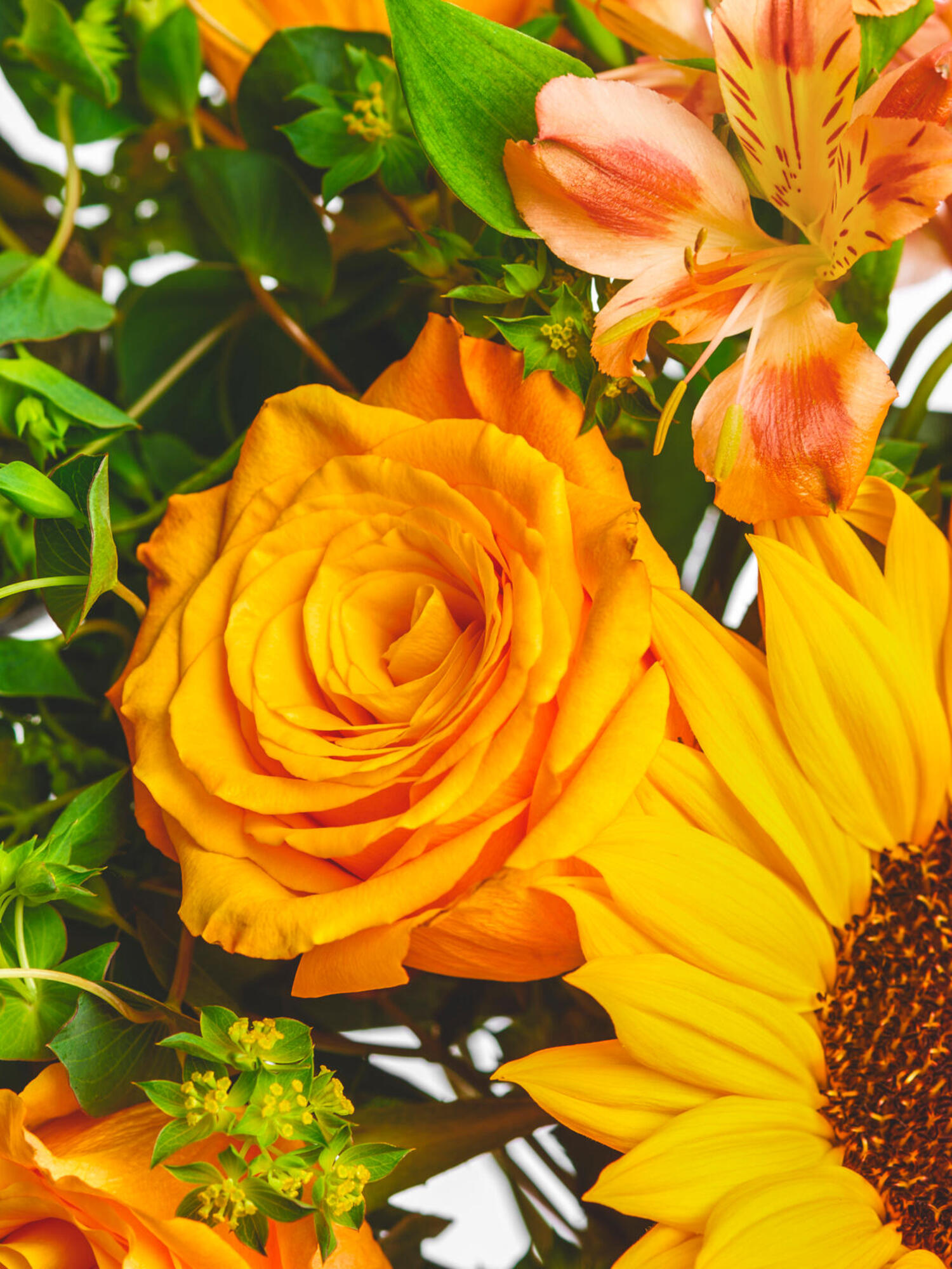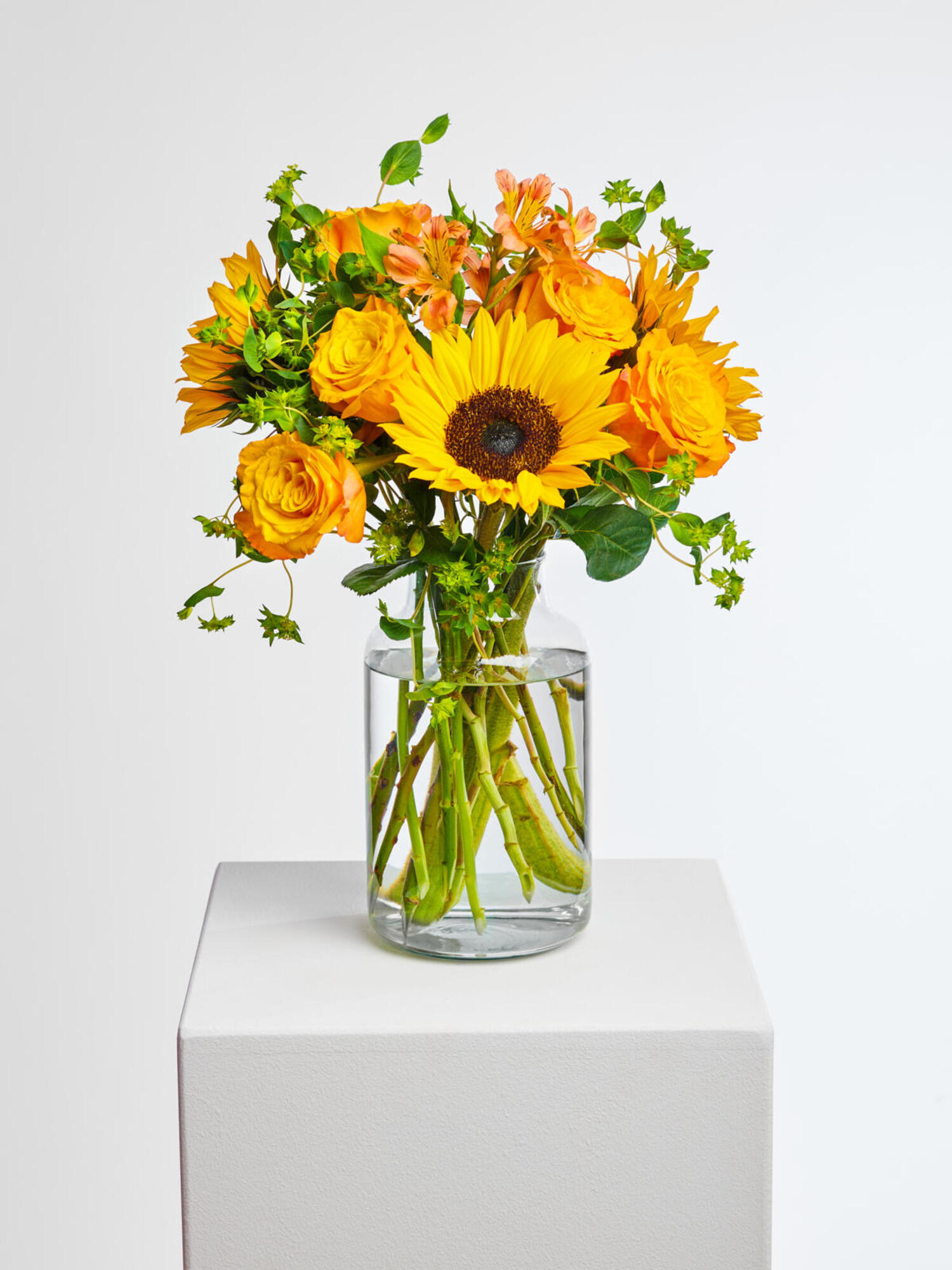 Verschenken Sie einen Blumengruß in leuchtenden Orange-Gelbtönen. Sie können die Rosen, Sonnenblumen, Alstromerien und Hasenohren in der eigenen Vase nach Belieben selbst arrangieren. Stilecht verpackt und geliefert im Fleurop-Karton.