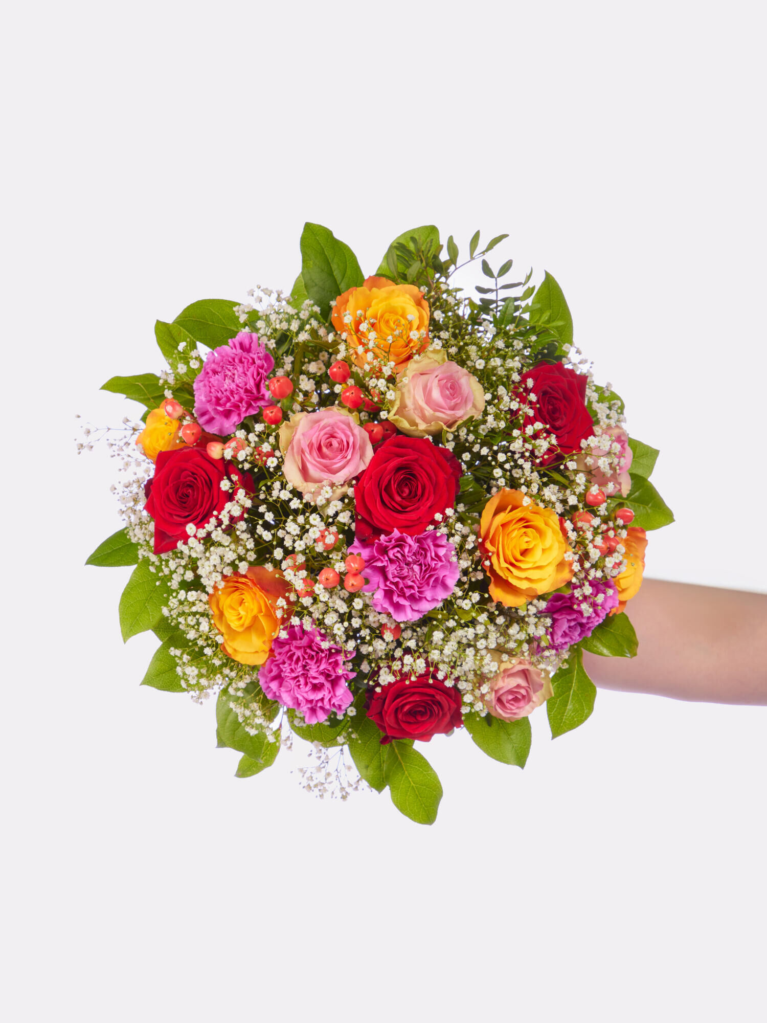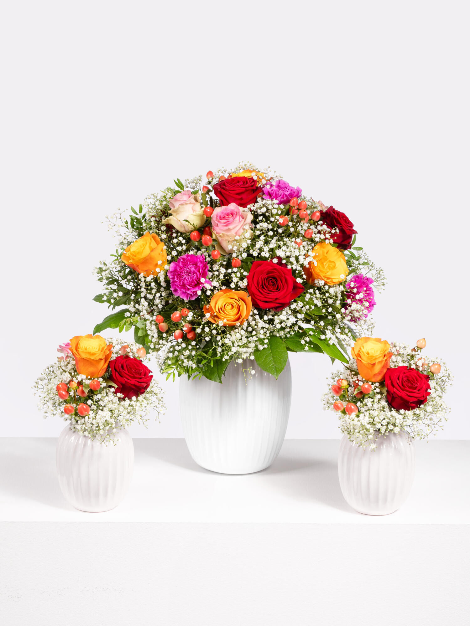 „Happy Twins“: Das Blumengeschenk für den großen Augenblick Die Welt hält den Atem an, wenn gleich zwei kleine Wunder geschehen. Winzige Händchen greifen nach deinen Fingern und zwei neue Sterne leuchten am Himmel. Dies ist der Moment unendlicher Freude und tiefer Emotionen: Genau für diese magischen Augenblicke haben wir einen ganz besonderen Blumenstrauß kreiert, der die Wärme, Liebe und das Glück eines Neuanfangs perfekt einfängt: Unser „Happy Twins“-Strauß. Dieses Arrangement besteht aus einem großen rundgebundenen Strauß für die frischgebackene Mama und zwei kleinen Sträußchen, die symbolisch für die neugeborenen Zwillinge stehen. Drei Blumensträuße, die durch ihre zärtliche Umarmung aus Blüten jeden verzaubern und in einem harmonischen Zusammenspiel von Rot, Rosa, Orange und Pink erstrahlen. Jede Blüte wurde mit Bedacht gewählt, um die Reinheit und Süße dieses Ereignisses zu symbolisieren. Samtige großblütige Rosen stehen für die bedingungslose Liebe, zarte Nelken für die tiefe Zuneigung, während leuchtendes Hypericum und luftiges Schleierkraut dem Arrangement Leichtigkeit und Fröhlichkeit verleihen. Das frische Grün von Pistazie und Salal rahmt diese Blütenpracht stilvoll ein und unterstreicht die natürliche Schönheit. „Happy Twins“ ist mehr als nur ein Blumenstrauß; es ist eine liebevolle Geste, die den frischgebackenen Eltern zeigt, wie sehr man sich mit ihnen freut. Das perfekte Geschenk für die doppelte Freude einer Zwillingsgeburt – diese drei Sträuße überbringen Ihre herzlichen Glückwünsche auf die wohl schönste Art und Weise. Feiern Sie die Ankunft neuen Lebens und schaffen Sie eine unvergessliche Erinnerung für die glücklichen Eltern.