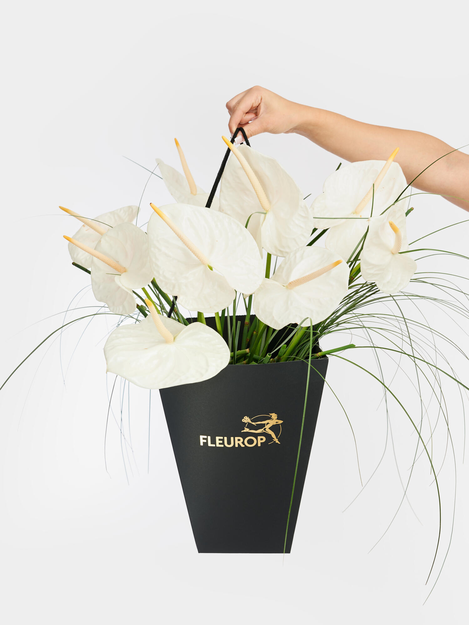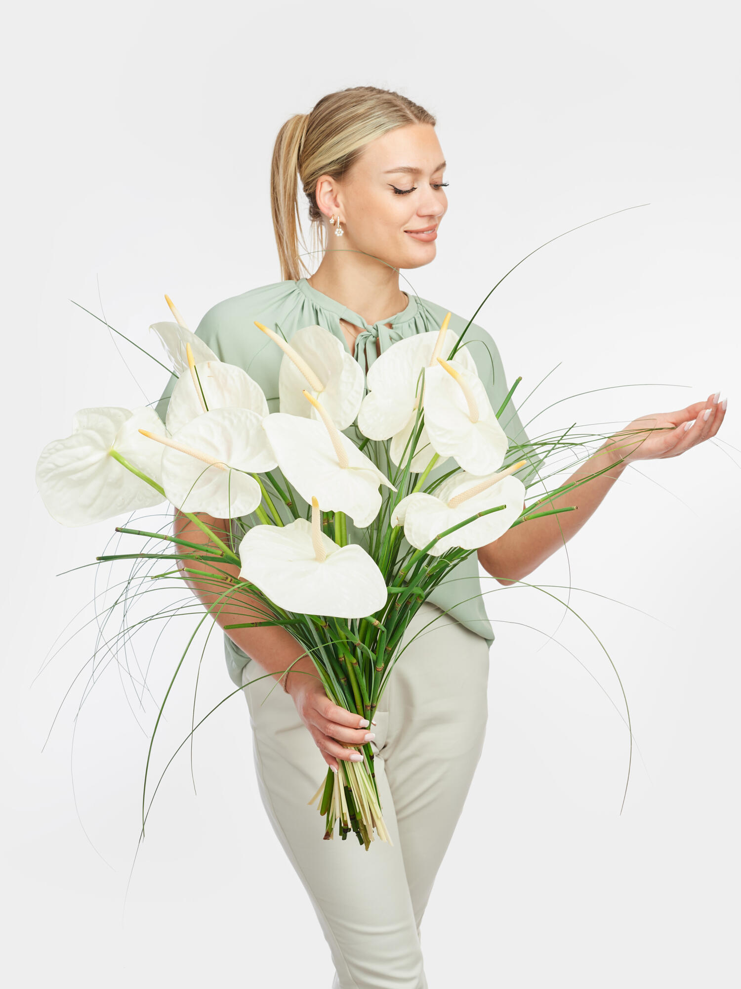 Verschenken Sie dieses dekorative Highlight. Gestaffelt gebundener Strauß aus strahlend weißen Anthurien und filigranem Equisetum.