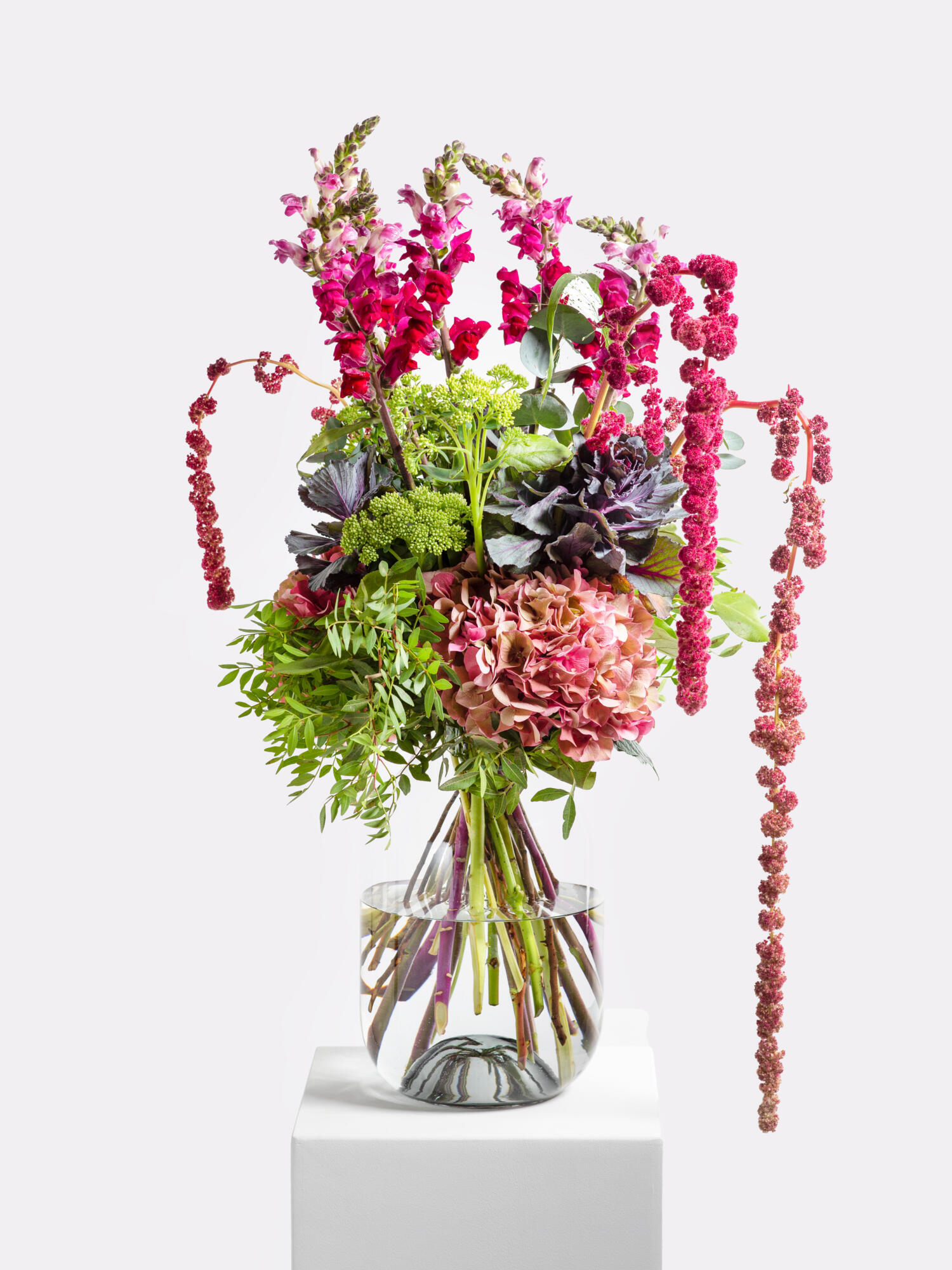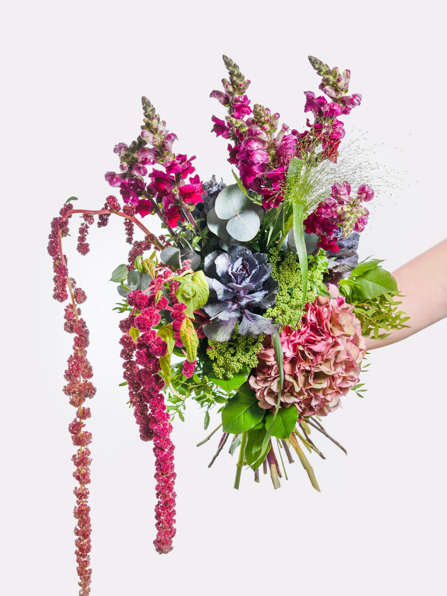 Locker gebundener Strauß in Rot-Grün-Violett mit Löwenmaul, Sedum, Hortensie, Zierkohl und Amaranthus. Als Beiwerk werden Pistazie, Salal und Eucalyptus verwendet.