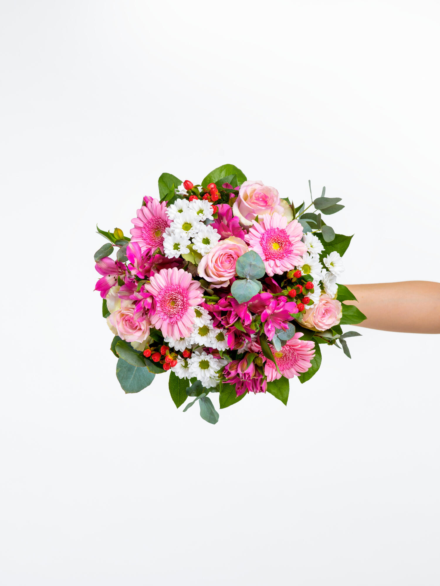 Lieferung innerhalb von 100 Minuten. Bestellbar immer montags bis freitags von 10:00 bis 15:00 Uhr. Überraschen Sie jemanden mit diesem liebevoll arrangierten Blumenstrauß. Rund gebundener Strauß in Weiß-Rosa-Pink mit Rosen, Santini, Inkalilien (Alstroemerien) und Hypericum. Als Beiwerk werden Eukalyptus und Salal verwendet.
