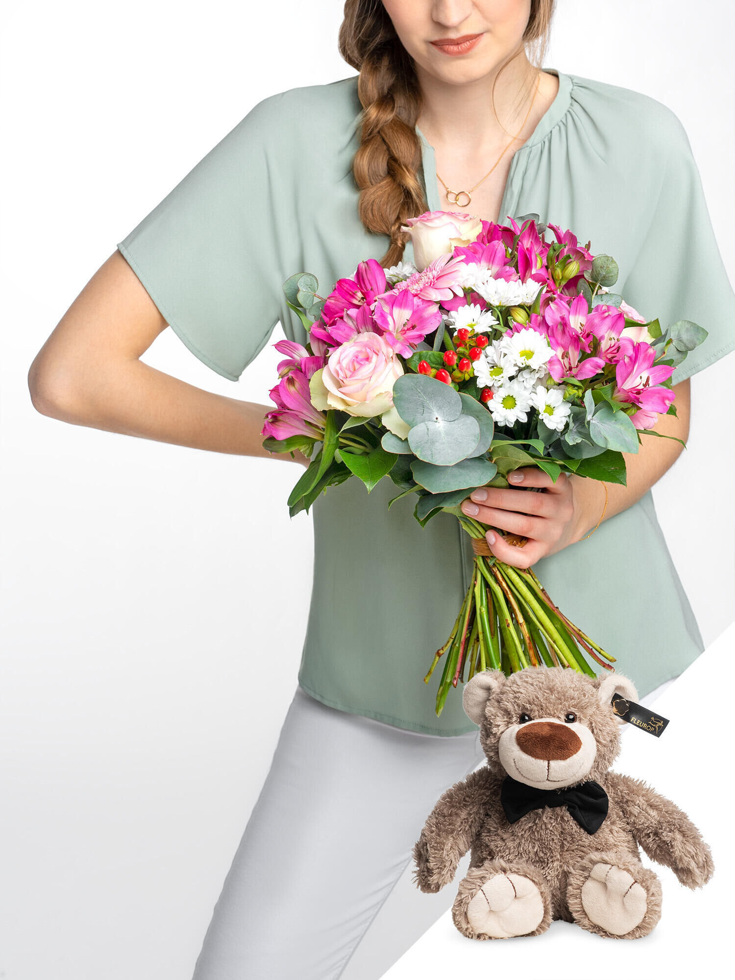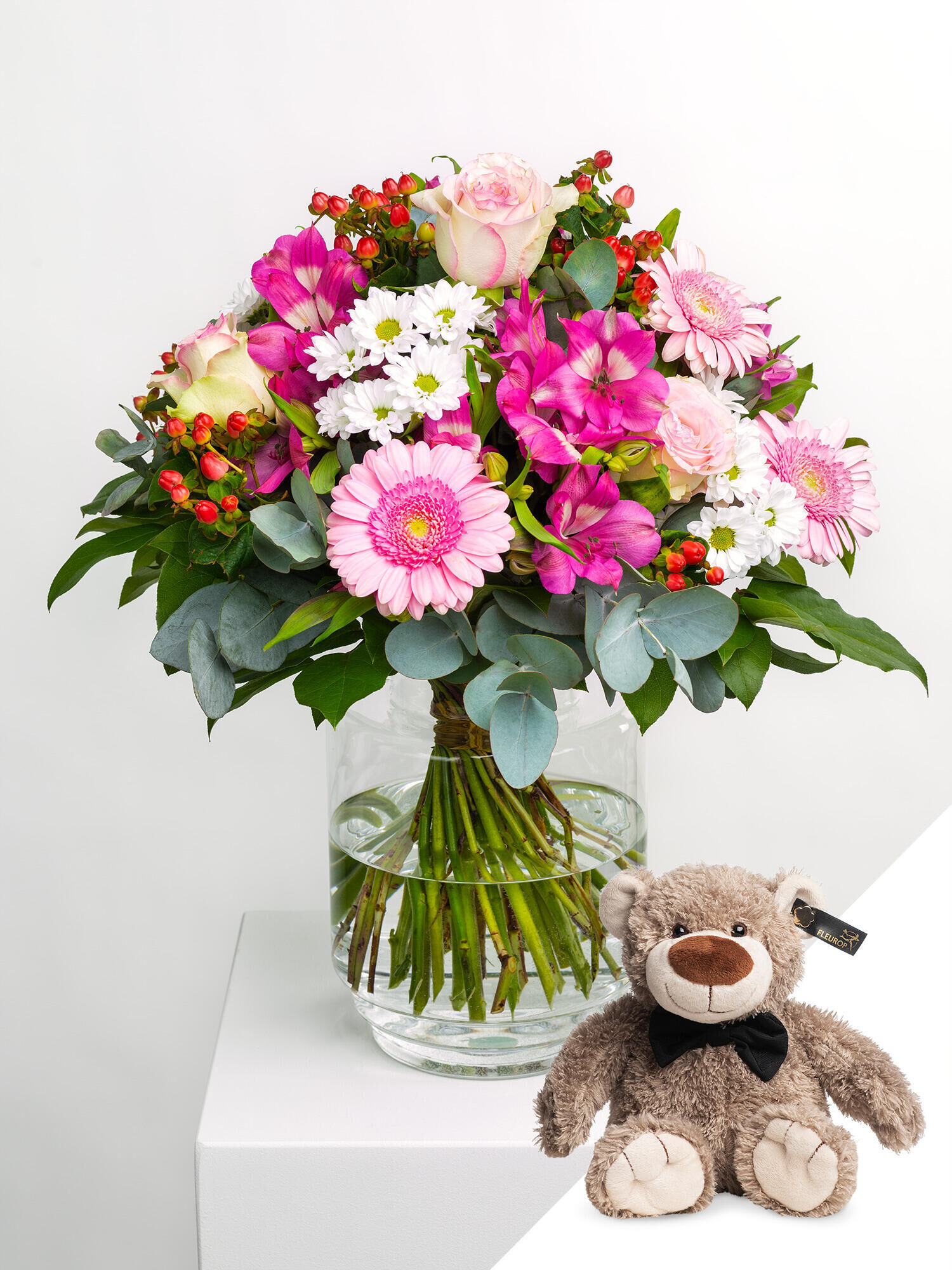 Die bunten Blumenstrauß „Herzenszauber“ und Teddy Felix verschicken mit dem Fleurop Blumenversand. ➤ Jetzt online bestellen und Freude verschenken!