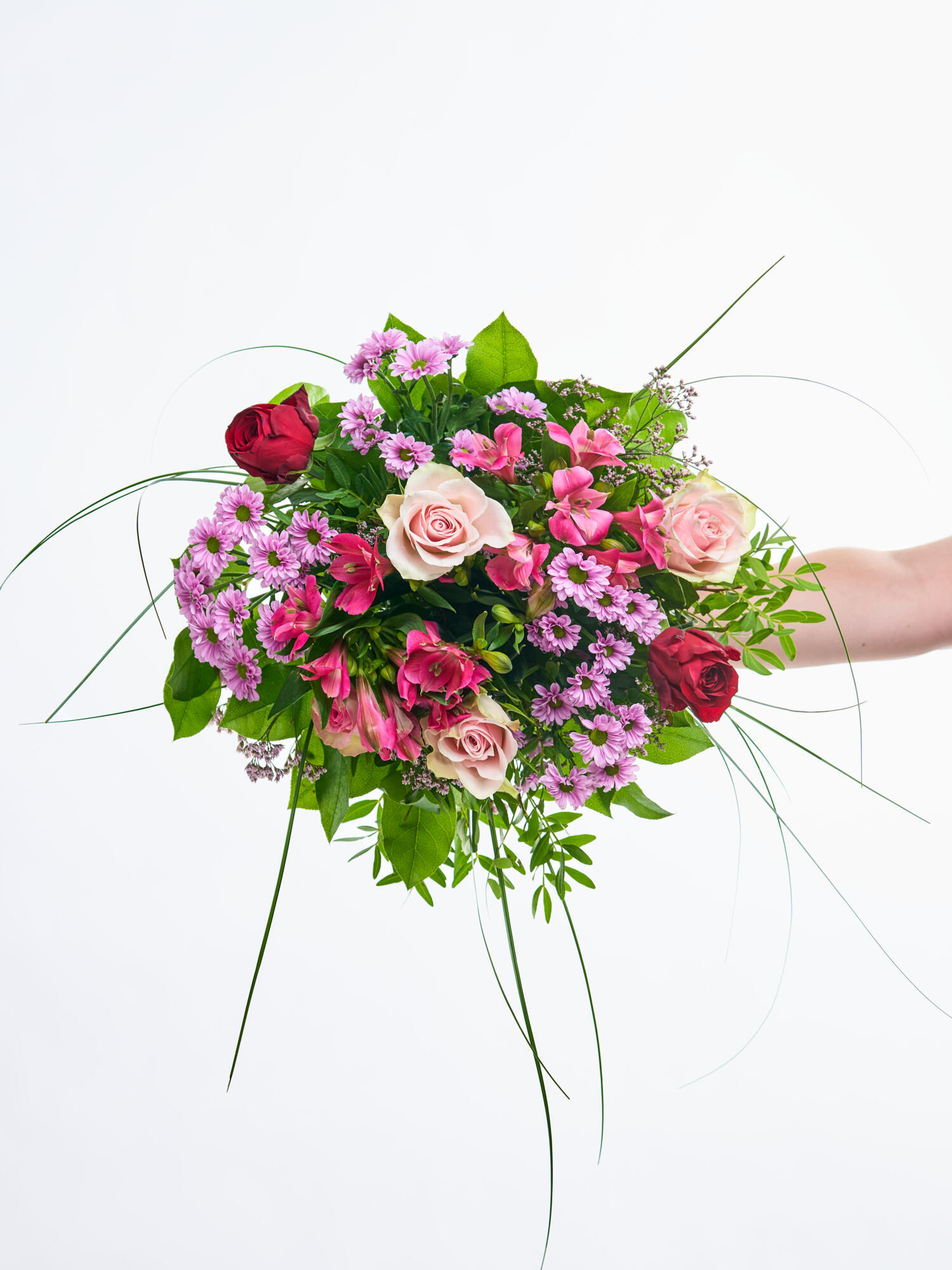 Rund gebundener Strauß in Rot-Pink-Rosa mit Rosen, Santini, Strandflieder und Inkalilien (Alstromerien). Als Beiwerk werden Salal, Pistazie und Bärgras verwendet.