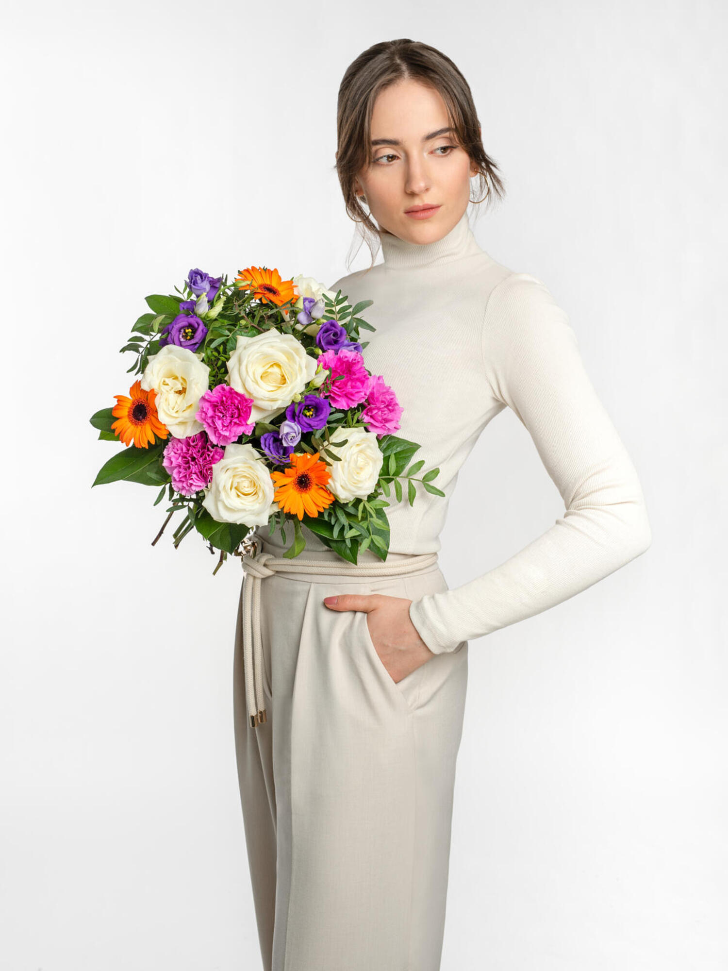 Verschicken Sie diesen hübschen Blumenstrauß als Zeichen Ihres Dankes. Rund gebundener Strauß in Weiß-Orange-Pink-Violett mit Rosen, Eustoma, Nelken und Germini. Als Beiwerk werden Pistazie und Salal verwendet.