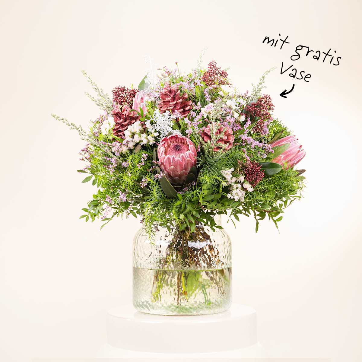 Wann hast du dich das letzte Mal bei deinem Lieblingsmenschen bedankt? Wie, du weißt es nicht mehr so genau? Dann wird es aber höchste Zeit, denn schließlich haben wir bald Weihnachten. Mit unserem Blumenstrauß Holly schenkst du Freude pur – sozusagen ein Dankeschön zum Anfassen! Er enthält Strauchstrohblumen, Salal, Limonium, Pistazie und Statice. Skimmien, Sicheltanne und Kieferngrün unterstreichen den winterlichen Charme des Arrangements. Mit 40 cm Stiellänge lassen sich die Blumen für jede beliebige Vase kürzen. Die passende Vase, designed by BLUME2000, ist ebenfalls im Lieferumfang enthalten. Das hübsche Exemplar ist mundgeblasen und aus 100 % Recycling-Glas gefertigt. Somit leistest du noch einen Beitrag zum Umweltschutz. Produziert wurde sie in Europa. Die Farben des Ensembles reichen von kräftigem Rot und winterlichem Grün bis hin zu strahlendem Weiß. Was meinst du, wird dieser Anblick deinen Herzensmenschen verzaubern? Wir glauben ganz fest daran.